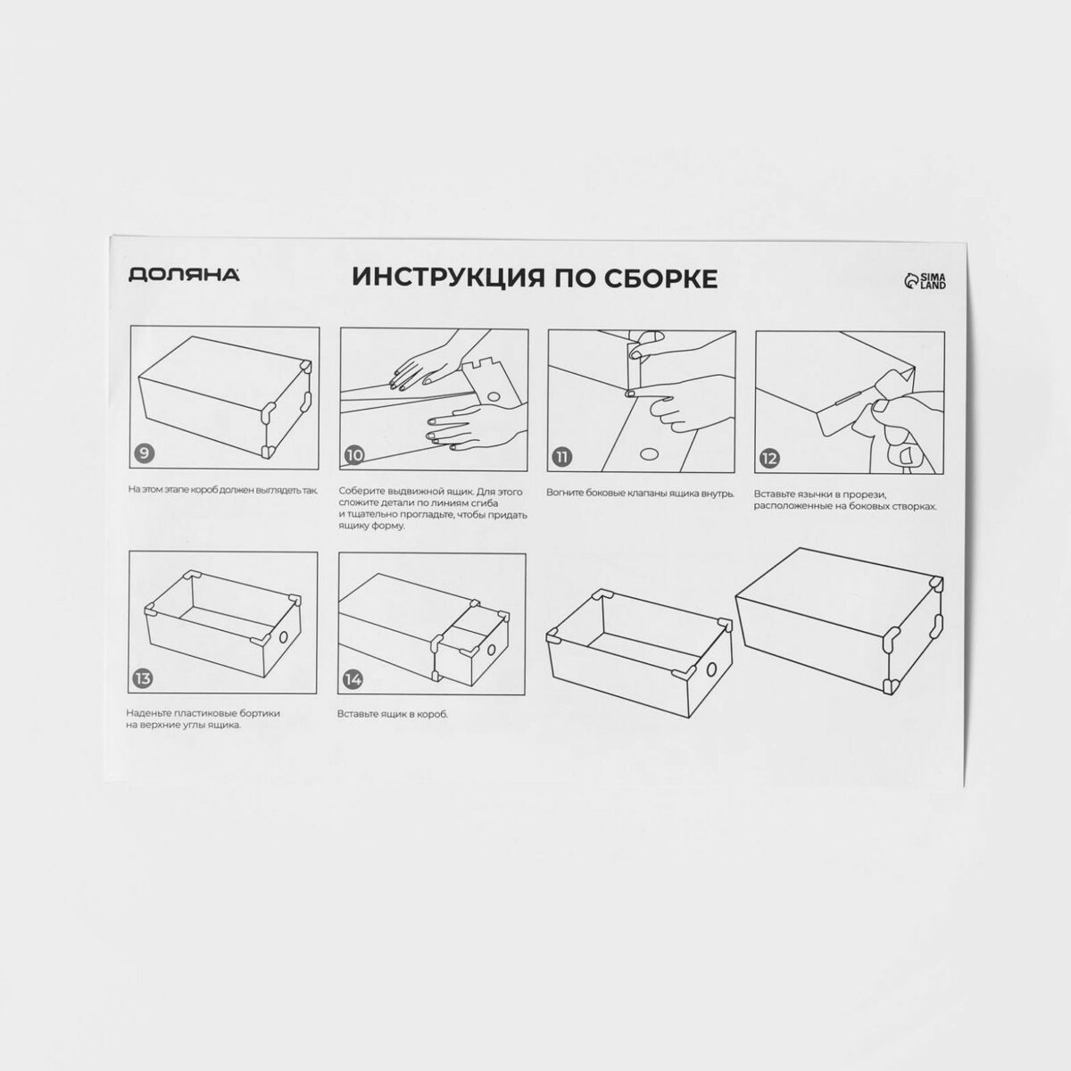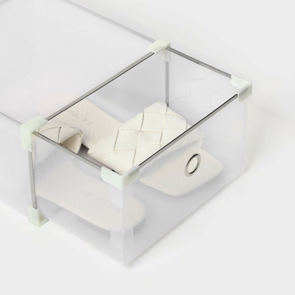 Коробки оснащены выдвижным механизмом, что делает процесс хранения и извлечения обуви максимально удобным. Выдвижная конструкция позволяет легко получить доступ к содержимому без необходимости снимать коробку с полки.