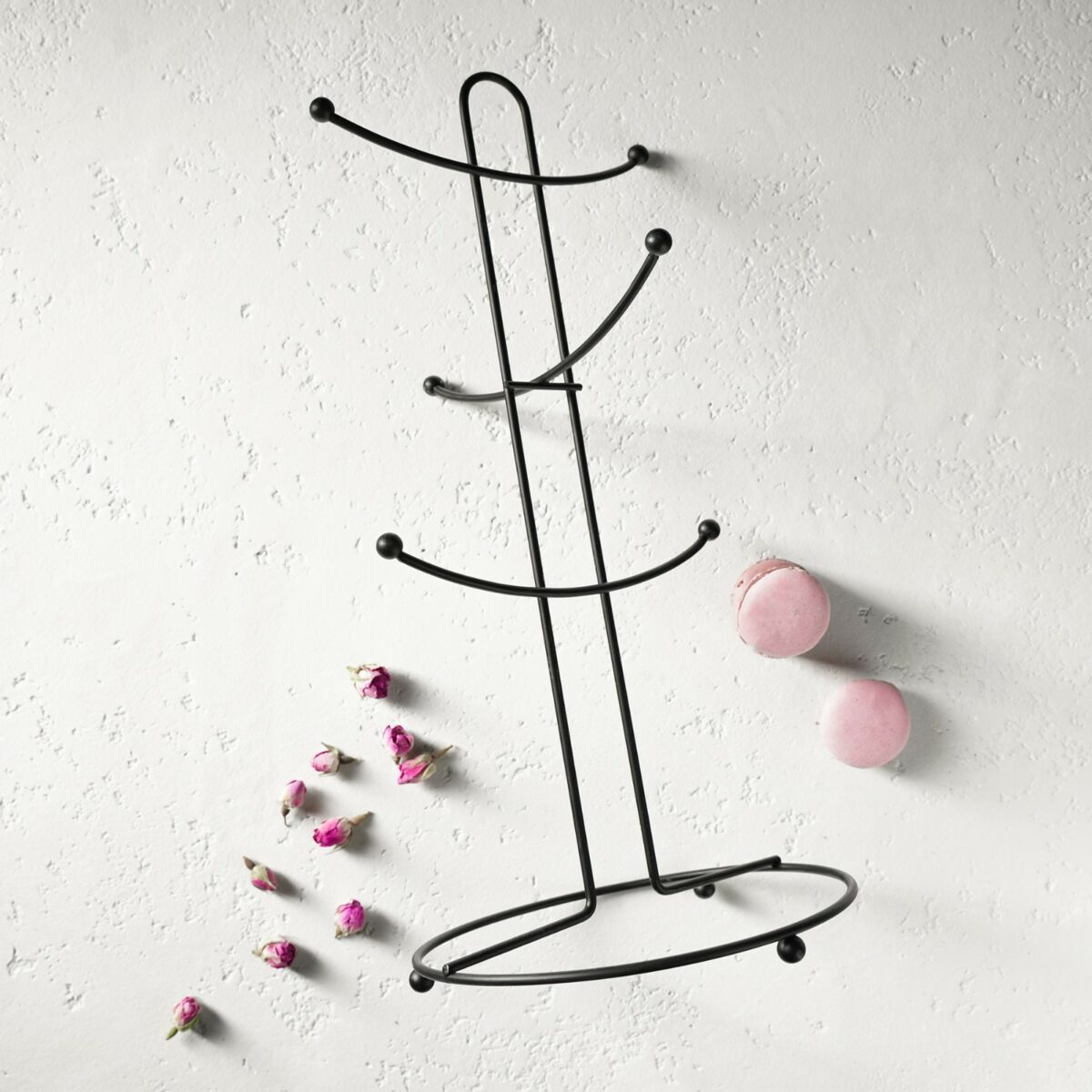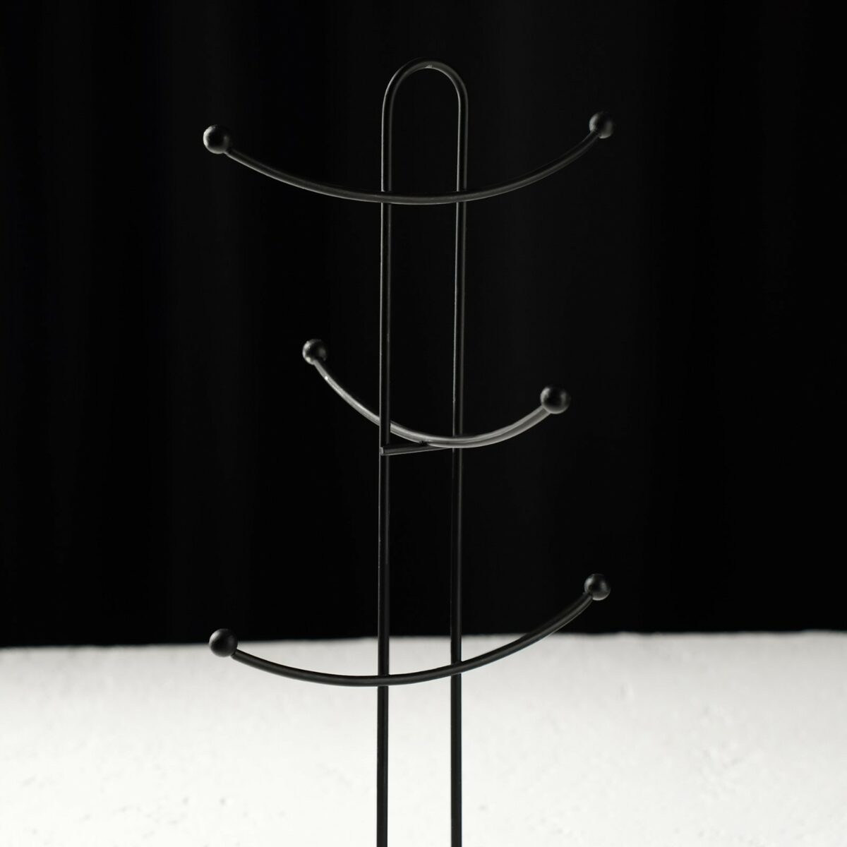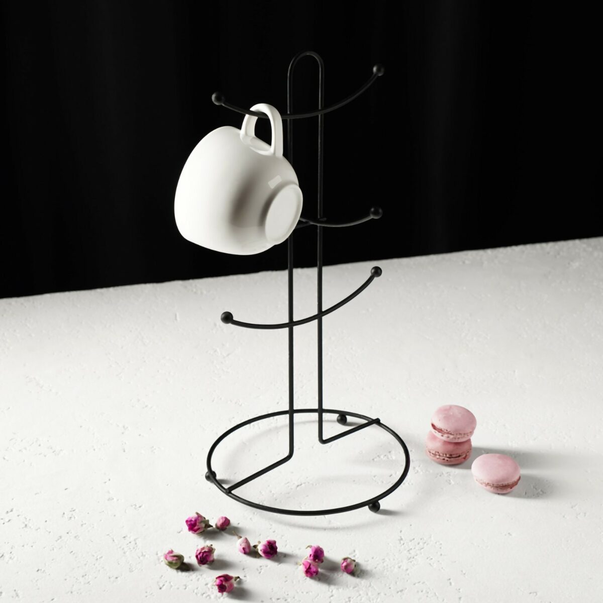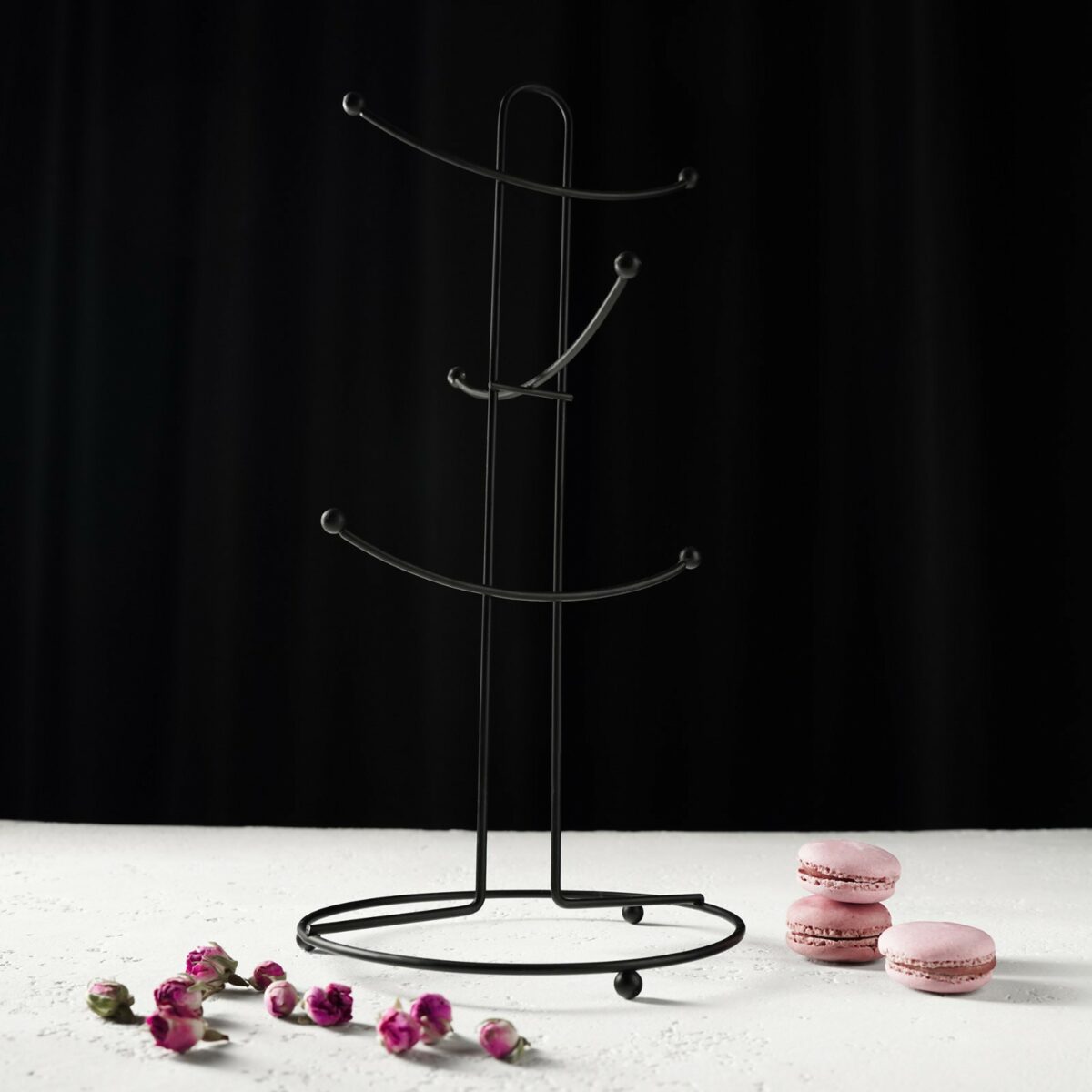 Компактный держатель для кружек обладает продуманной конструкцией. Он состоит из стойки с круглым основанием, обеспечивающим устойчивость, и трех уровней изогнутых крючков, позволяющих надежно размещать до шести кружек. На концах каждого крючка присутствуют декоративные шарообразные элементы, предотвращающие соскальзывание и защищающие посуду от повреждений. Этот стильный черный держатель подходит как для хранения кухонной посуды, так и для демонстрации вашего сервиза. Разместите его на столе, и он непременно станет гармоничной частью вашей кухни.
