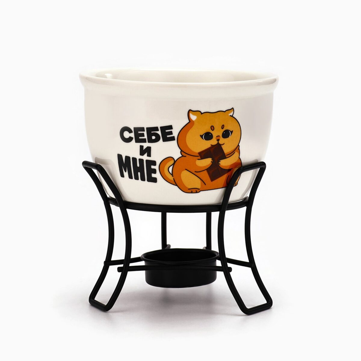 - Праздничный набор фондю украшен изображением забавного котика, добавляющим уникальности изделию.