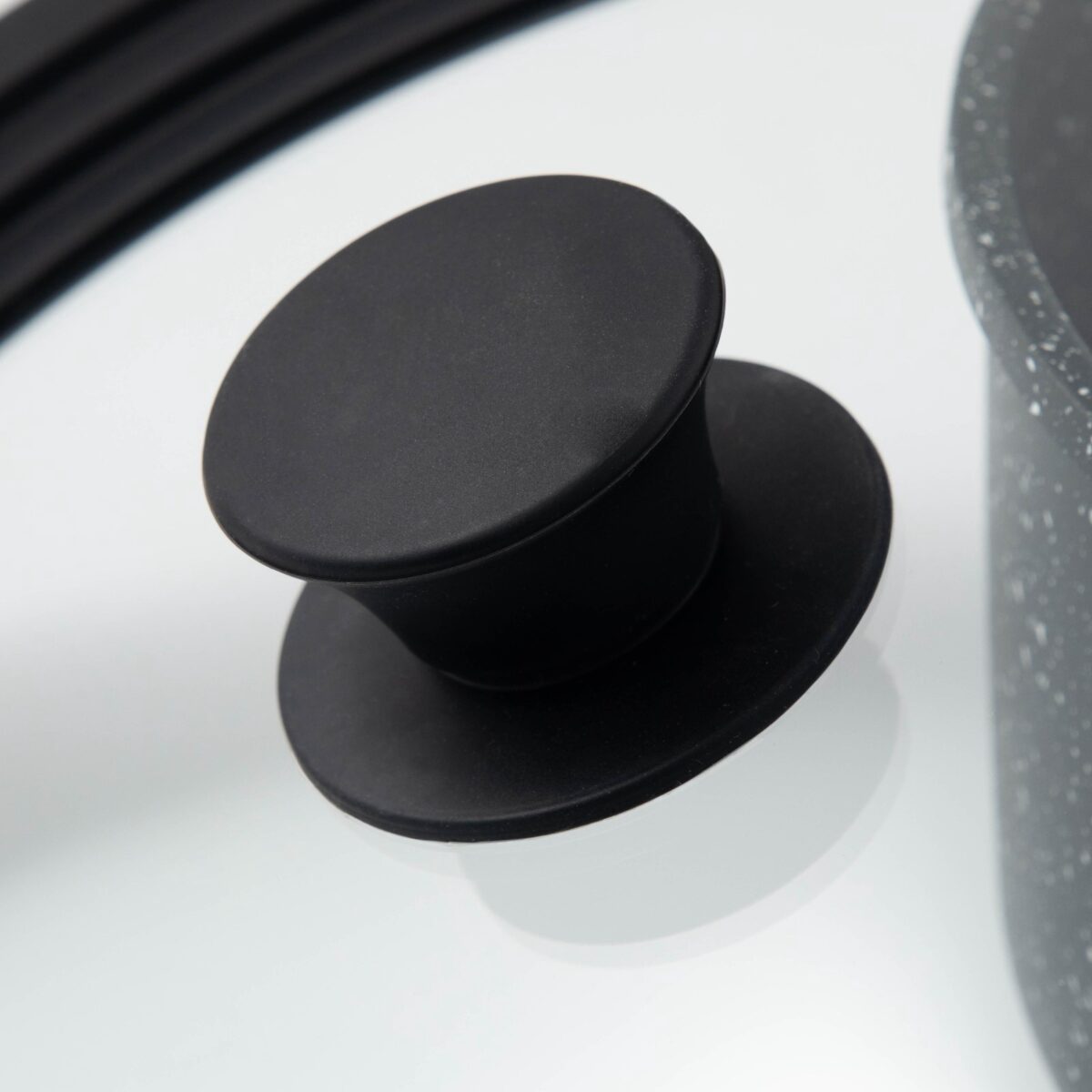 Крышка выполнена из прочного закалённого стекла, которое выдерживает высокие температуры и позволяет следить за приготовлением пищи. Ободок сделан из термостойкого силикона, а удобная ручка — из пластика, что предотвращает нагрев и обеспечивает комфортное использование.