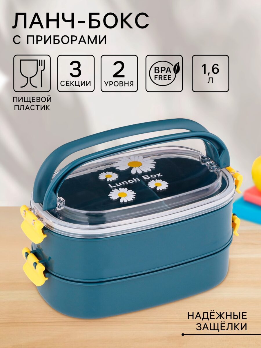Ланч-бокс в школу с приборами, контейнер для еды, пластиковый 1.6 л, 2 уровня, герметичный, для СВЧ и посудомойки