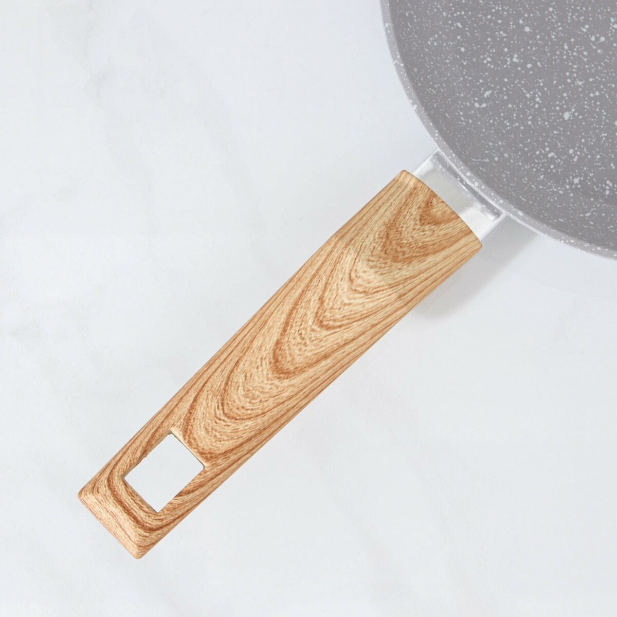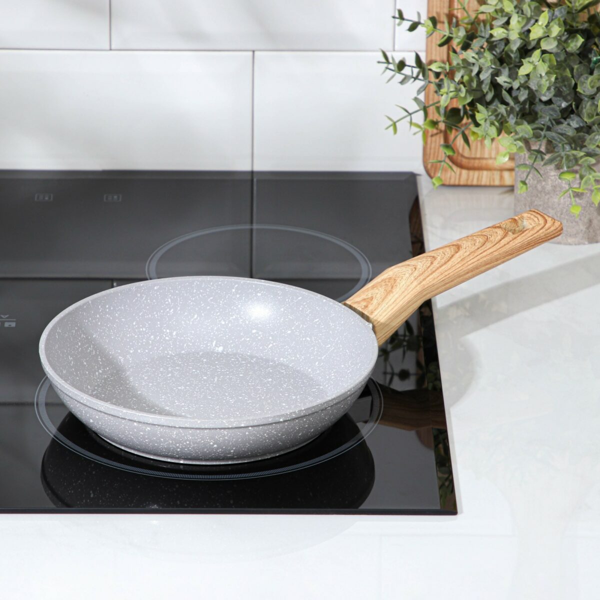Сковорода Magistro Natural – это сочетание функциональности, современного дизайна и превосходного качества. Выполненная из кованого алюминия, она отличается прочностью, долговечностью и стильным внешним видом. Антипригарное покрытие, имитирующее текстуру натурального камня, позволяет готовить любимые блюда без лишнего масла и заботиться о здоровье. А благодаря мягкой и удобной ручке soft-touch с эффектом дерева, процесс приготовления станет комфортным и безопасным. Эта стильная серая сковорода идеально подходит для всех типов плит, включая индукционные, что подчёркивает её универсальность и продуманность.