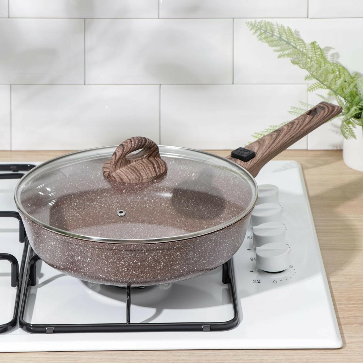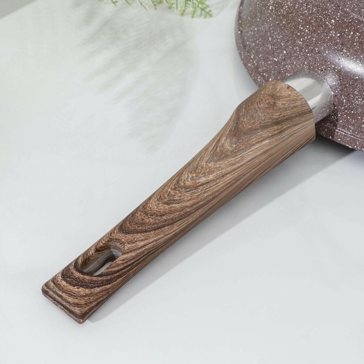 Сковорода Доляна «Брауни» — отличное решение для ценителей качественной посуды. Она идеально подойдёт для приготовления разнообразных блюд, будь то сочные стейки, деликатесные морепродукты или ароматные овощи. Лаконичный дизайн коричневого корпуса с каменной текстурой и стильными акцентами под дерево делает её не только функциональной, но и эстетически привлекательной, гармонично вписываясь в любой кухонный интерьер.