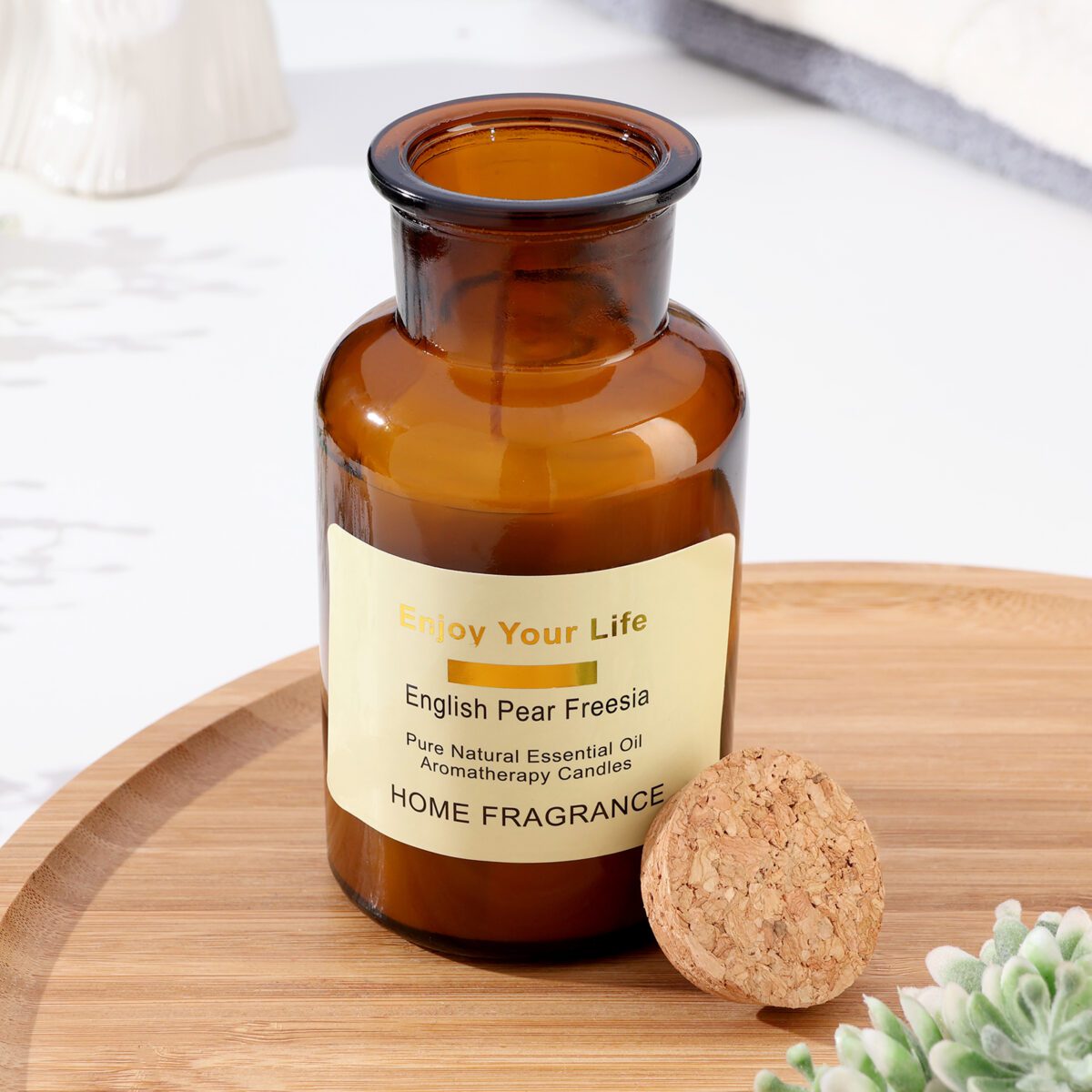 - Дизайн: Стильная стеклянная банка янтарного оттенка и пробковая крышка для сохранения аромата.