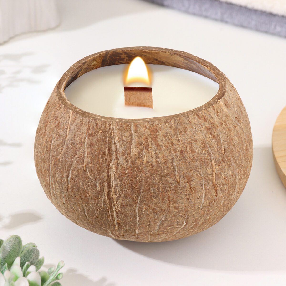 - Декорированная натуральность: естественная текстура кокоса делает каждую свечу уникальной.