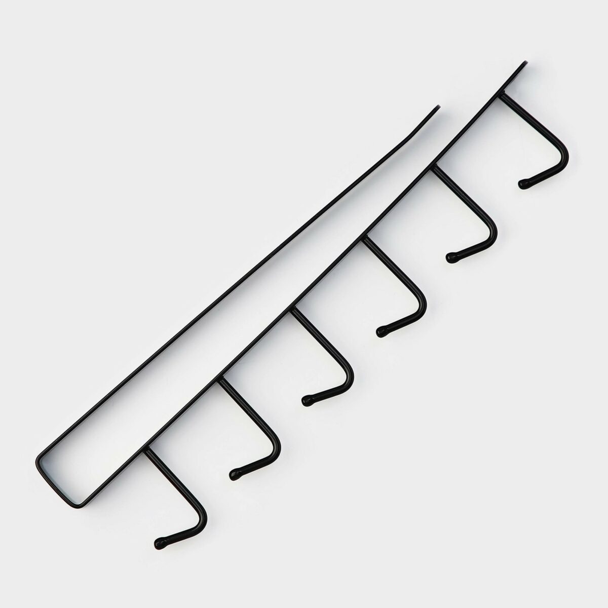 | Особенности конструкции | Овальные крючки равномерно распределены по длине держателя; загибы для крепления обеспечивают фиксацию на полке или столе |