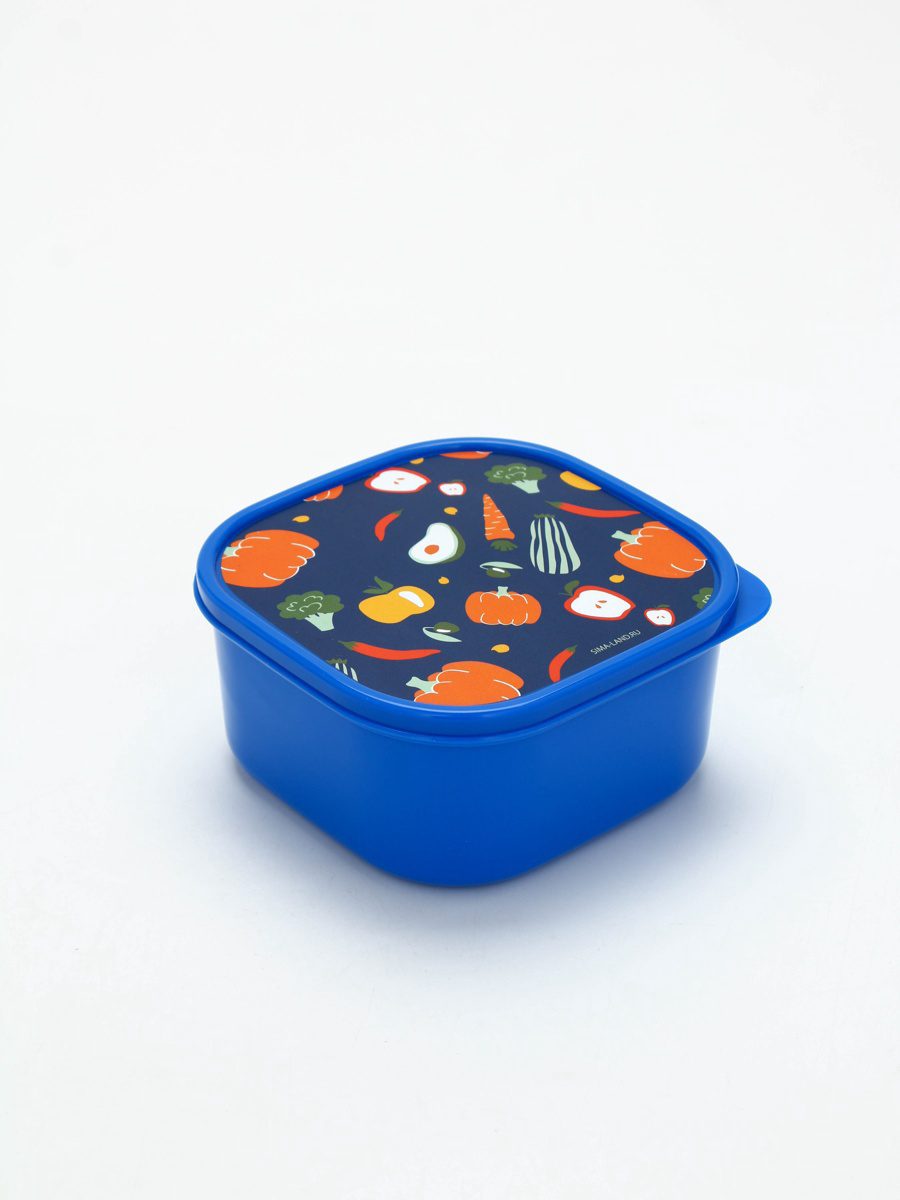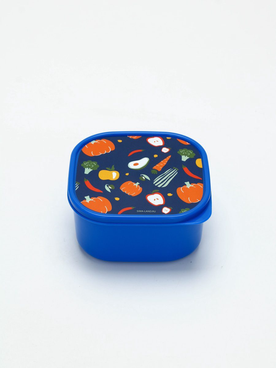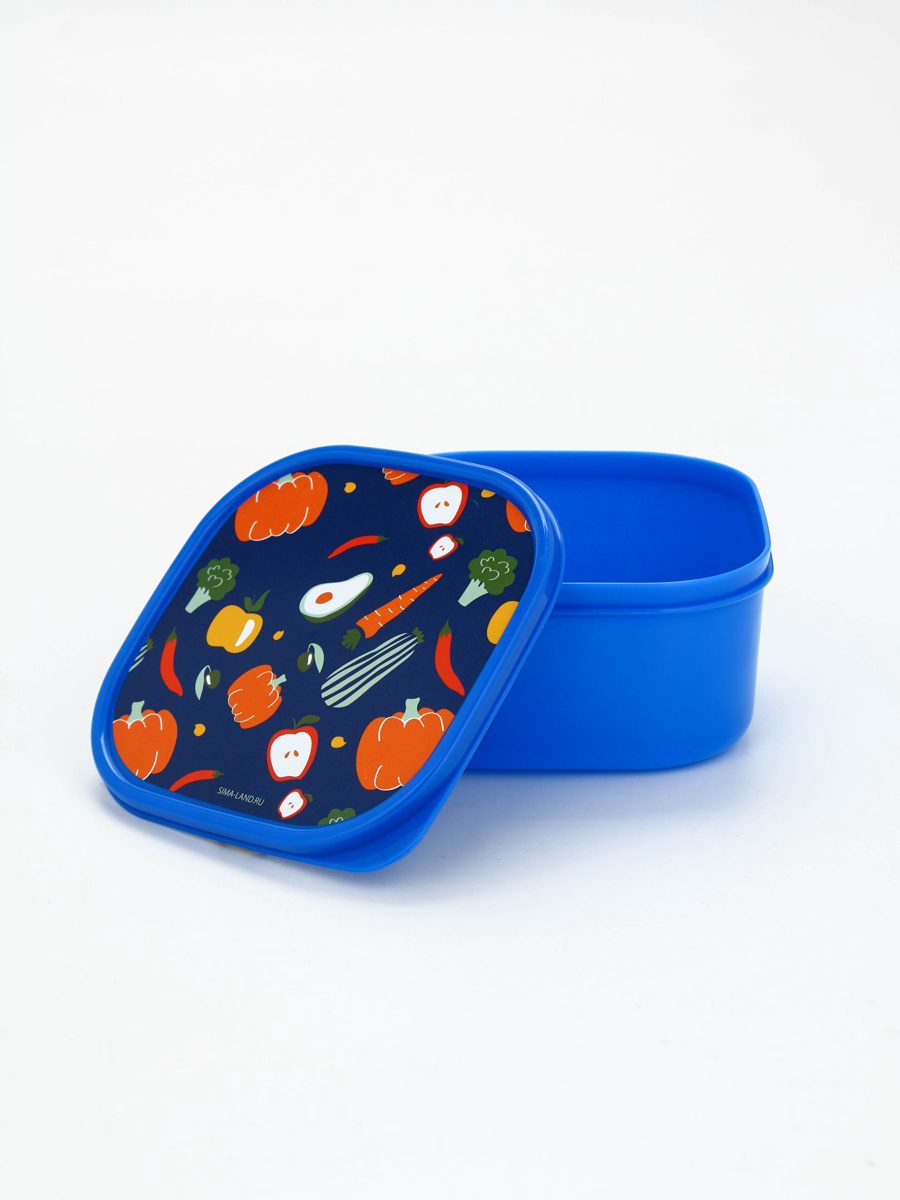 Дизайн крышки заслуживает отдельного внимания. Она оформлена с яркими и насыщенными изображениями популярных овощей — тыквы, моркови, авокадо, брокколи и яблок. Красочный мультяшный стиль привносит позитив и мотивирует к выбору здоровой пищи. Основной цвет корпуса контейнера — синий, а крышка выполнена в темно-синем оттенке, что создаёт гармоничную цветовую гамму.
