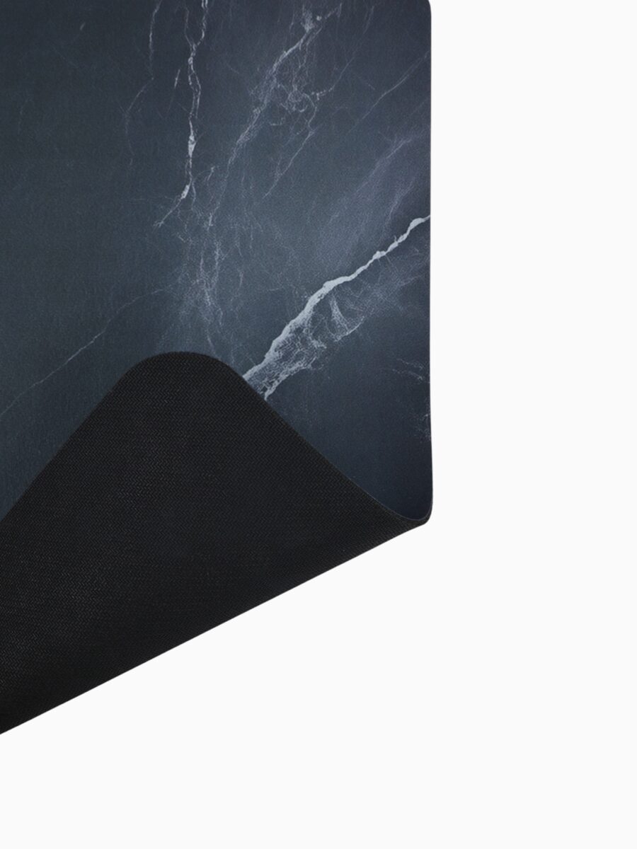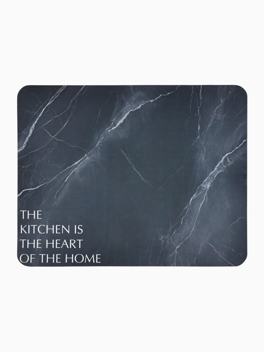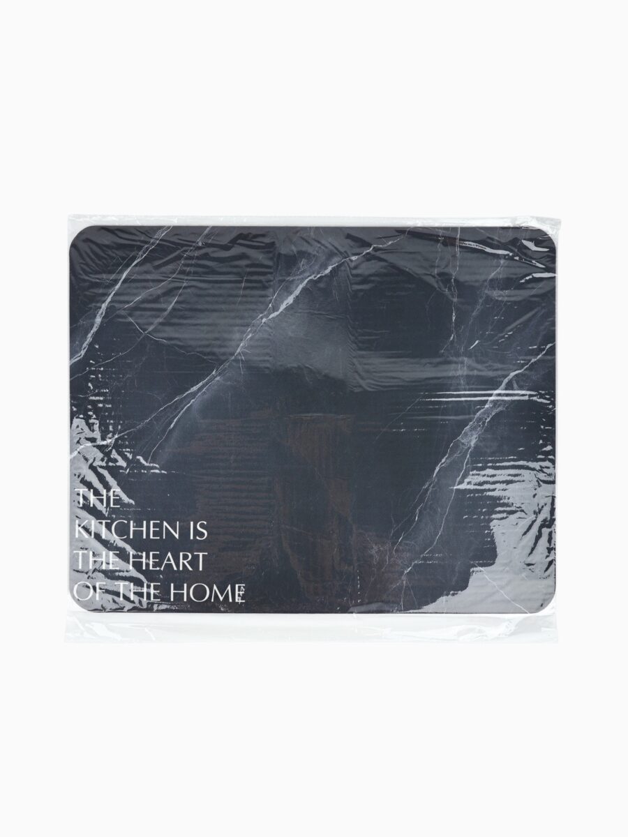 Особенное внимание стоит уделить размерам коврика — 40×50 см. Такой формат делает его компактным и универсальным, что позволяет использовать изделие даже в небольших кухнях. Закругленные углы добавляют эстетики, а материал коврика гарантирует долговечность и устойчивость. «Мраморный» узор в тёмно-сером цвете с белыми прожилками несомненно станет стильным акцентом, гармонирующим с любым кухонным оформлением.