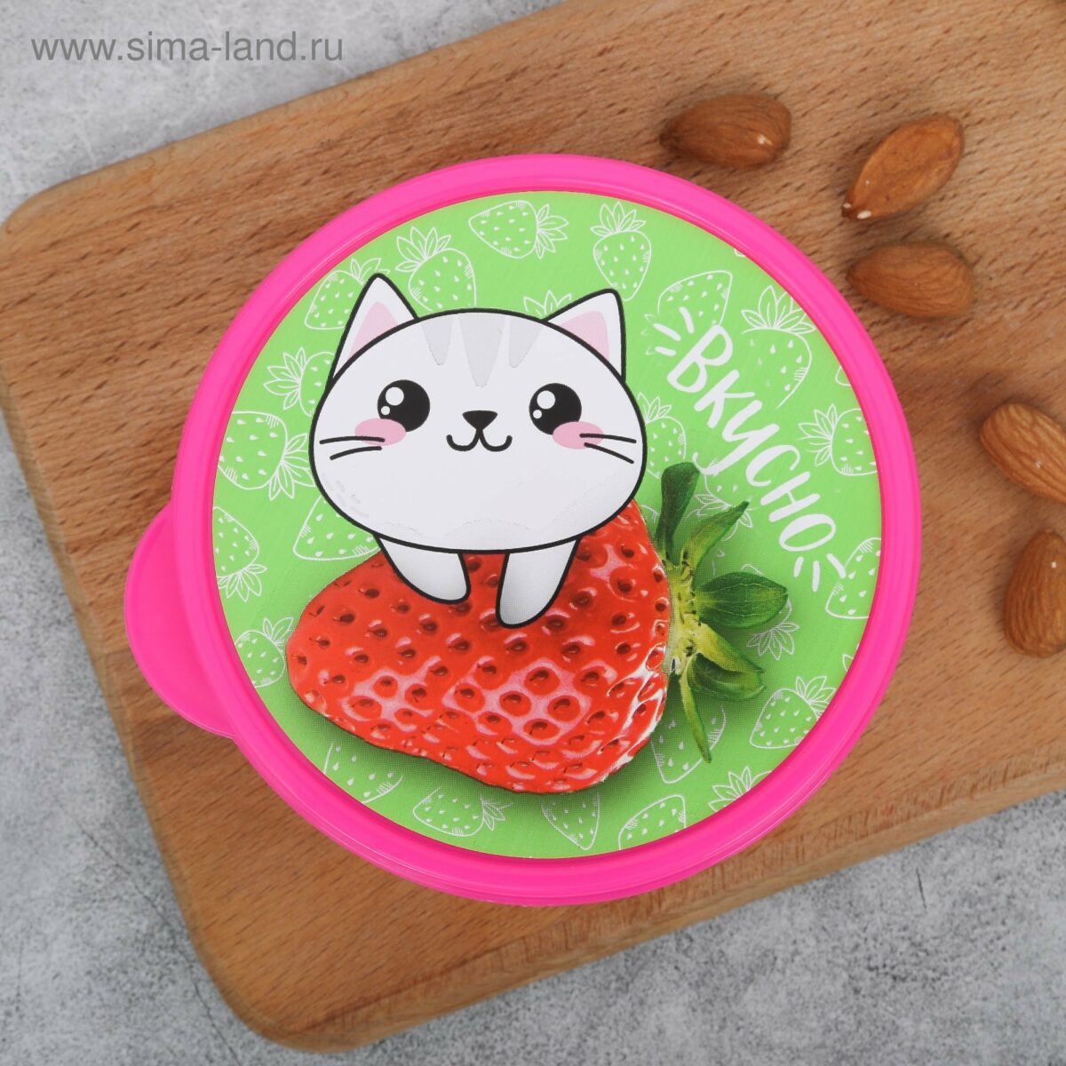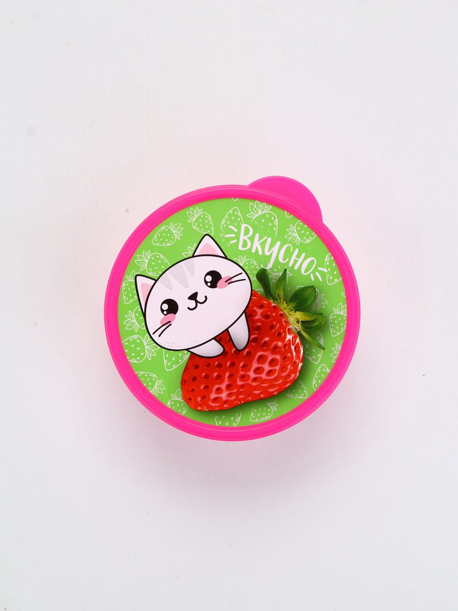 | Оформление крышки | Рисунок мультяшного котика на клубнике, зеленый фон с мелкими клубниками, надпись «Вкусно» белого цвета |