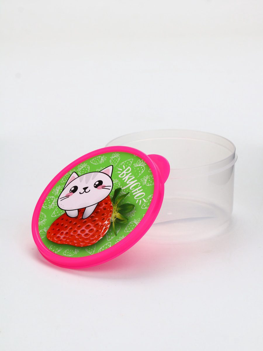 Основные преимущества ланч-бокса – его герметичность и способность сохранять пищу теплой. Контейнер выполнен из высококачественного пищевого пластика, что обеспечивает надежность и долговечность. Круглая форма делает его удобным для хранения супов, перекусов или десертов, а компактные размеры позволяют легко разместить его в сумке или рюкзаке. Розовая крышка украшена ярким рисунком, на котором изображен белый кот на крупной клубнике с надписью «Вкусно». Это не только функциональный аксессуар, но и стильное дополнение к вашему образу.