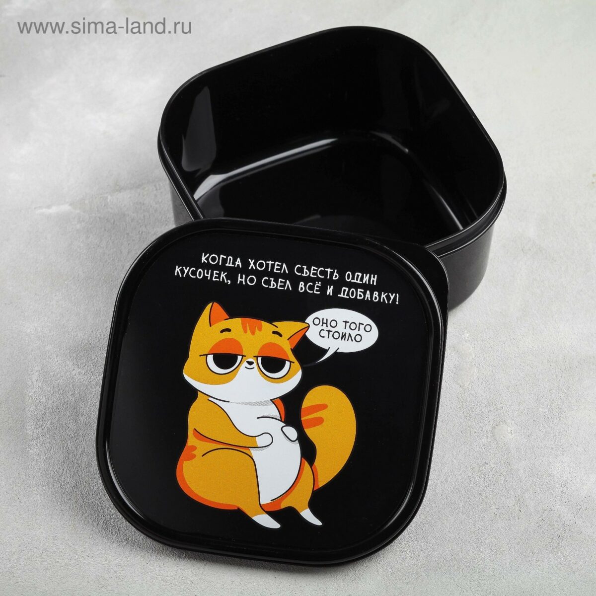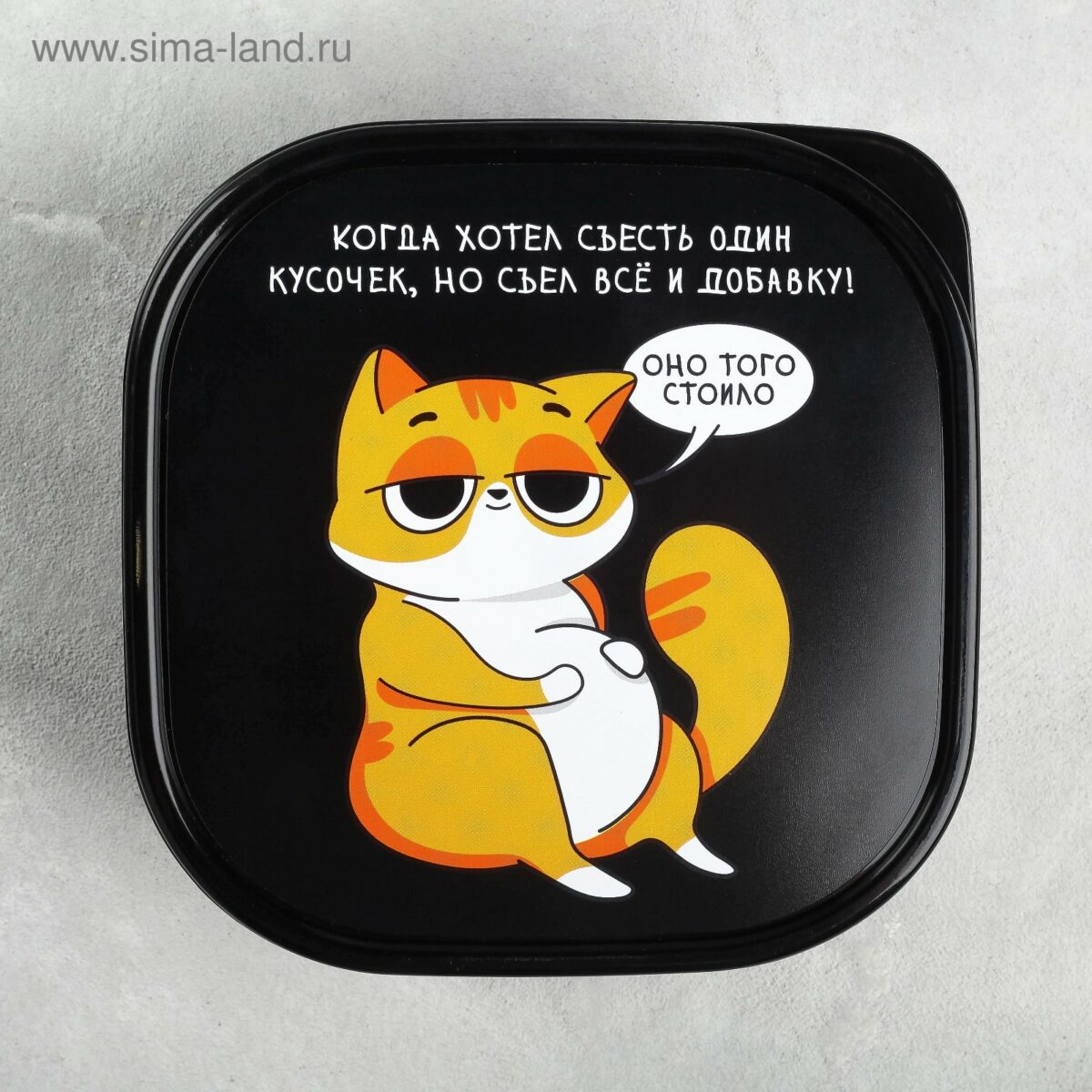 Благодаря удобной квадратной форме и объему 700 мл, ланч-бокс вмещает полноценный обед или перекус. Его компактные размеры (12,5 × 12,5 × 6,5 см) и небольшой вес (всего 75 г) делают контейнер идеальным для использования в школе, на работе или в дороге. Главная особенность этого ланч-бокса – крышка с изображением забавного рыжего кота и веселой надписью: «Когда хотел съесть один кусочек, но съел всё и добавку! Оно того стоило». Такой аккуратный и юморной дизайн точно поднимет настроение в любой момент дня.