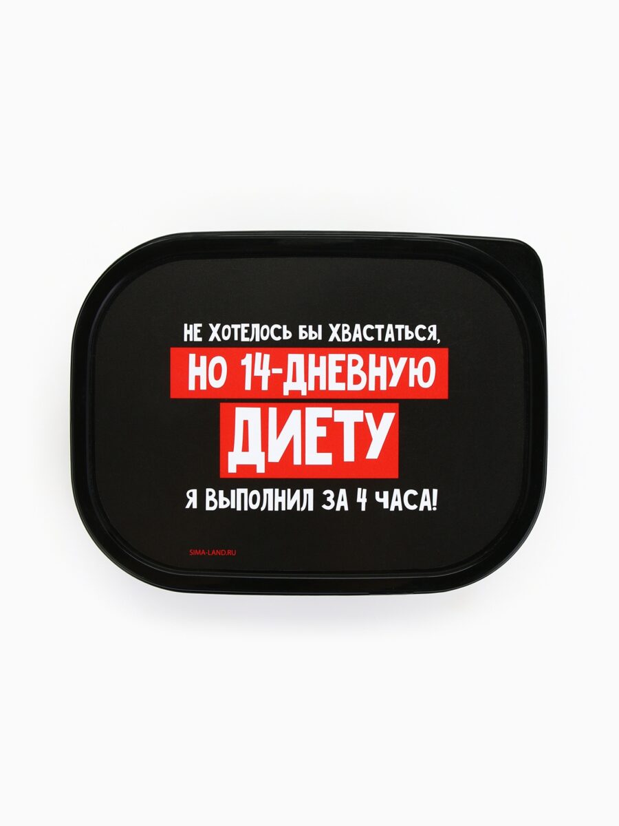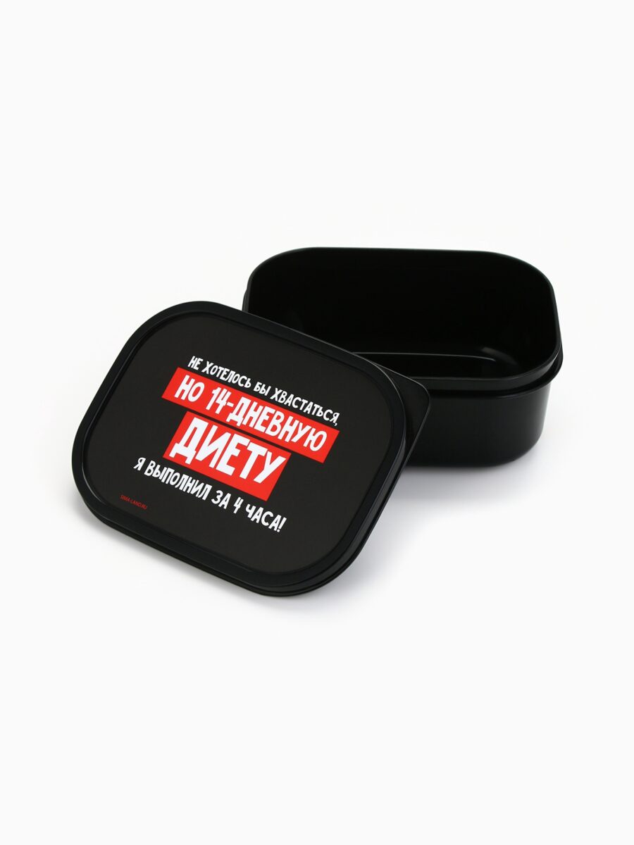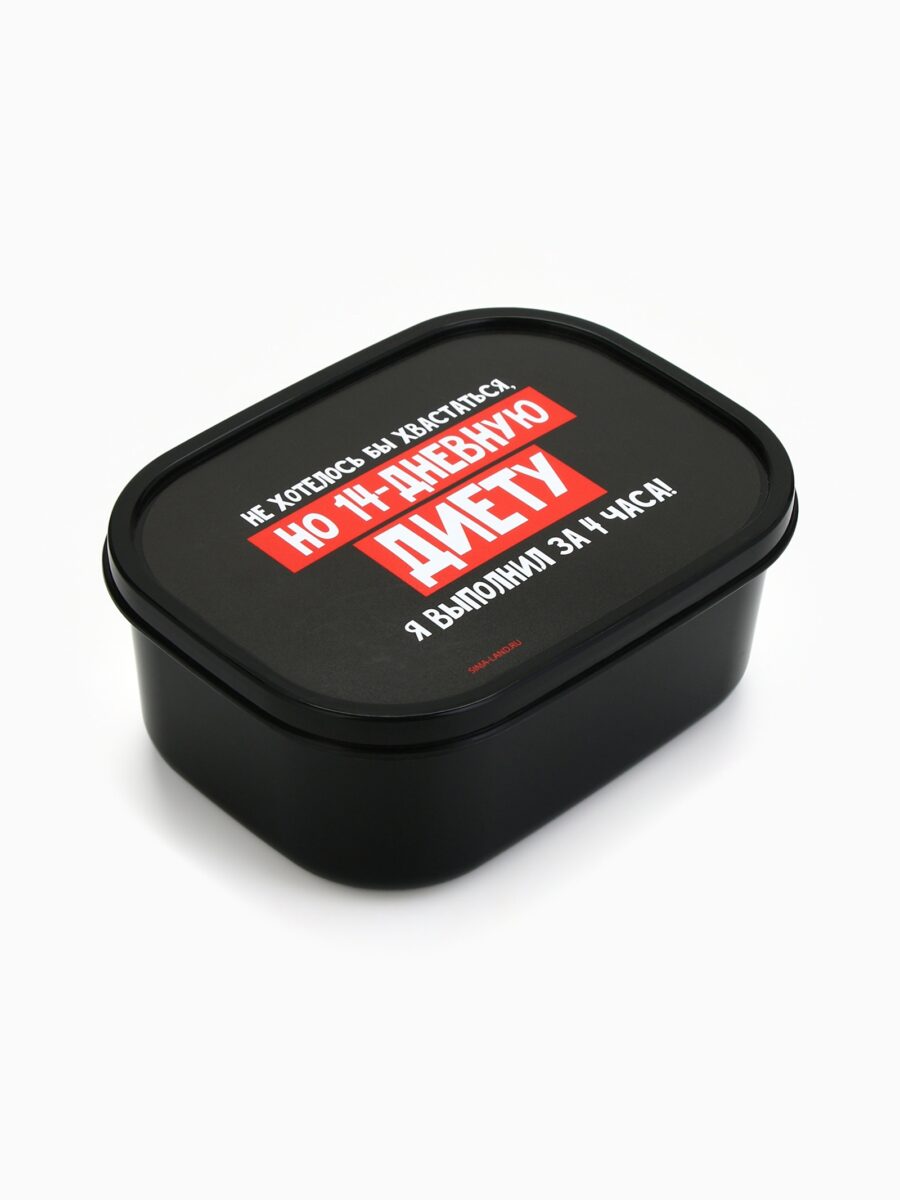Представляем вашему вниманию компактный ланч-бокс объемом 500 мл — идеальное решение для хранения и переноски еды на каждый день. Вдохновляющий дизайн и практичные характеристики делают его отличным выбором для любого, кто ценит комфорт и стиль. Этот ланч-бокс выполнен из черного пластика с яркой надписью на крышке: «Не хотелось бы хвастаться, но 14-дневную диету я выполнил за 4 часа!», что добавляет оригинальности и поднимает настроение. Изделие идеально подойдет как для взрослых, так и для детей, станет надежным атрибутом для офисных обедов, учебы или пикников.