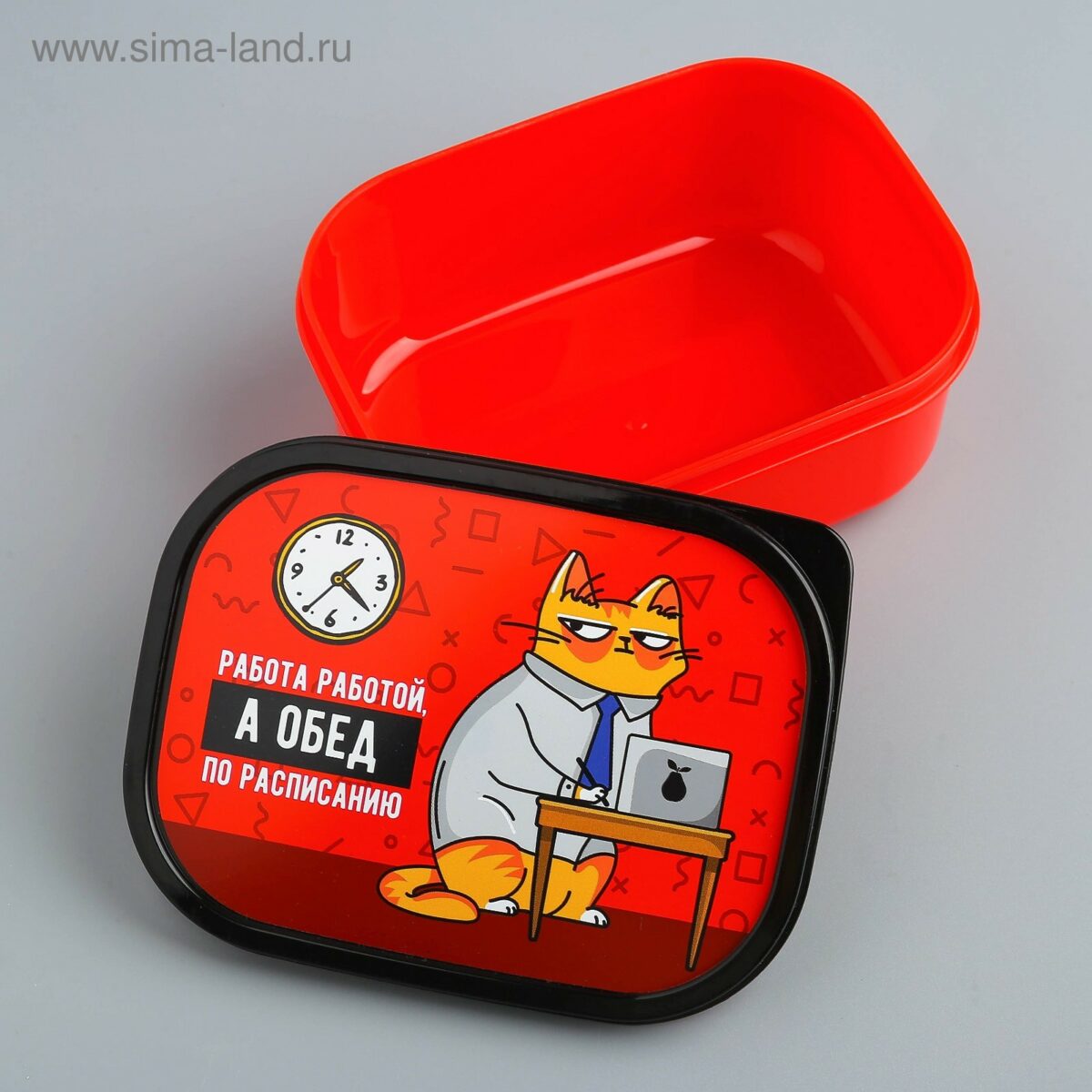На крышке размещена надпись «Работа работой, а обед по расписанию» — что создает веселое настроение при каждом открытии контейнера. Здесь же изображен рыжий мультяшный кот в официальном костюме, сидящий за компьютером. Эта забавная деталь акцентирует внимание на необходимом балансе между работой и небольшими жизненными удовольствиями, такими как обед. Такой дизайн отлично подойдет для офисных сотрудников, учеников и студентов, добавляя нотку позитивного настроя в ежедневный график.
