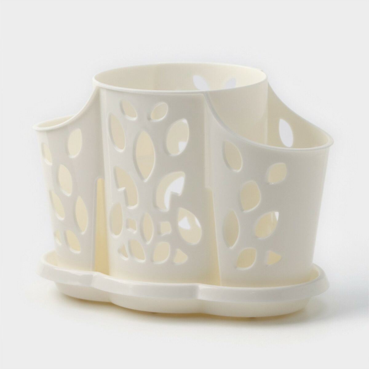 Основное внимание привлекает оригинальная конструкция подставки, включающая три секции, которые позволяют удобно организовать хранение таких столовых приборов, как вилки, ножи и ложки. Ажурные декоративные узоры на стенках изделия не только украшают его, но и выполняют функциональную роль: отверстия обеспечивают естественную вентиляцию и предотвращают сырость. Нижняя часть подставки снабжена поддоном, который собирает лишнюю влагу и защищает кухонную поверхность от капель воды.