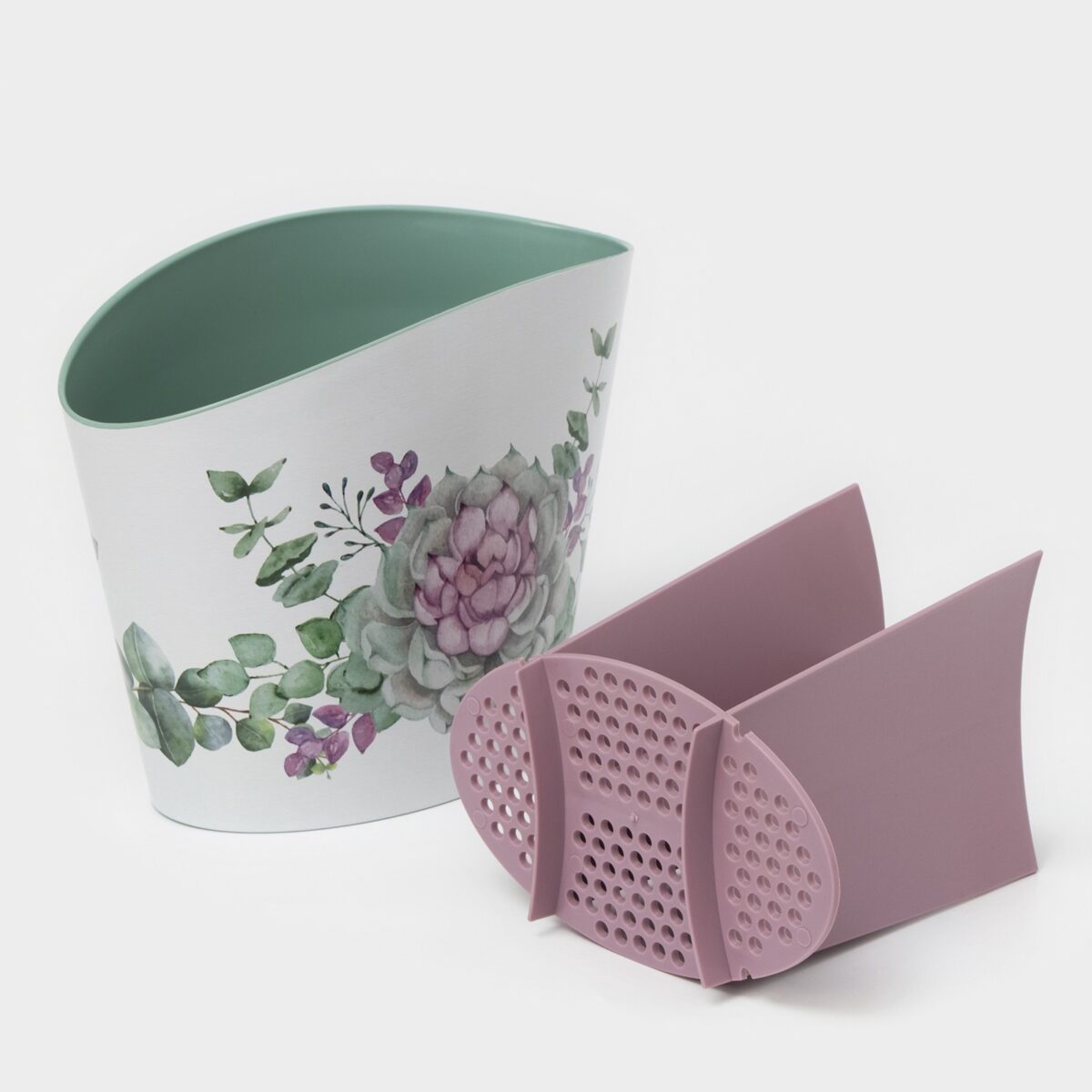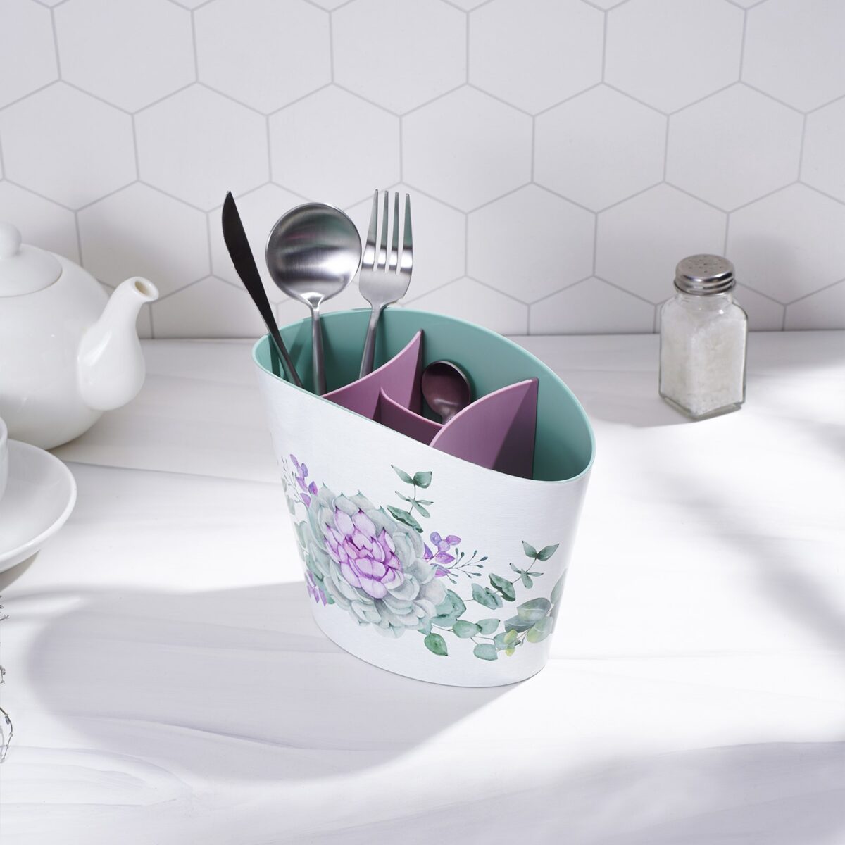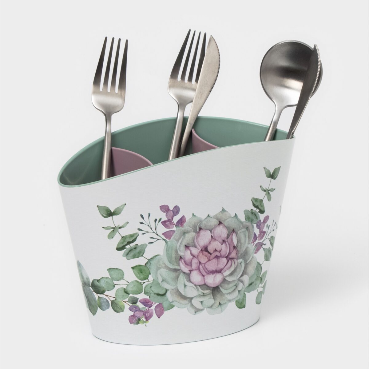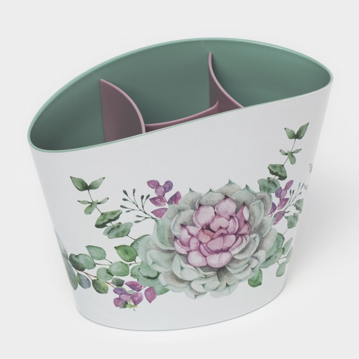 Эта подставка предназначена для удобного хранения вилок, ножей, ложек и иных кухонных принадлежностей. Её оформление радует глаз: центральной декоративной деталью является принт с изображением цветка каменной розы (эчеверии) в розово-зеленых тонах, дополненного нежными веточками с листьями и мелкими цветами. Такое украшение делает подставку не только функциональной, но и эстетичной. Она отлично впишется в современные светлые интерьеры или станет ярким акцентом в других стилях кухни.