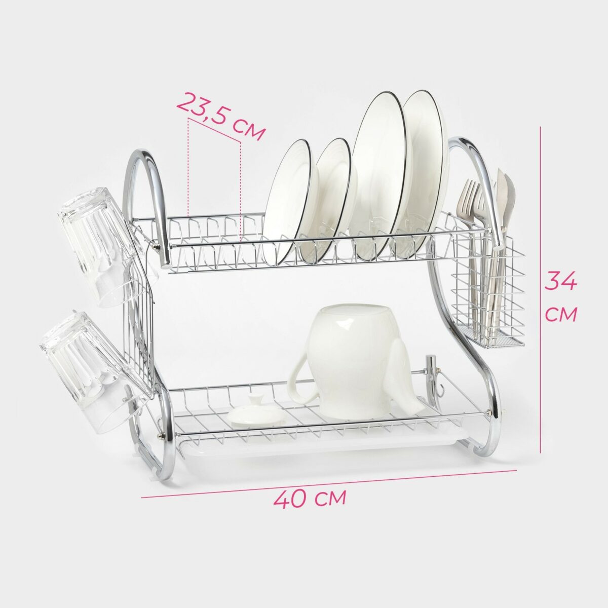 Сушилка для посуды хромированная двухъярусная настольная с поддоном, 40×23.5×34 см