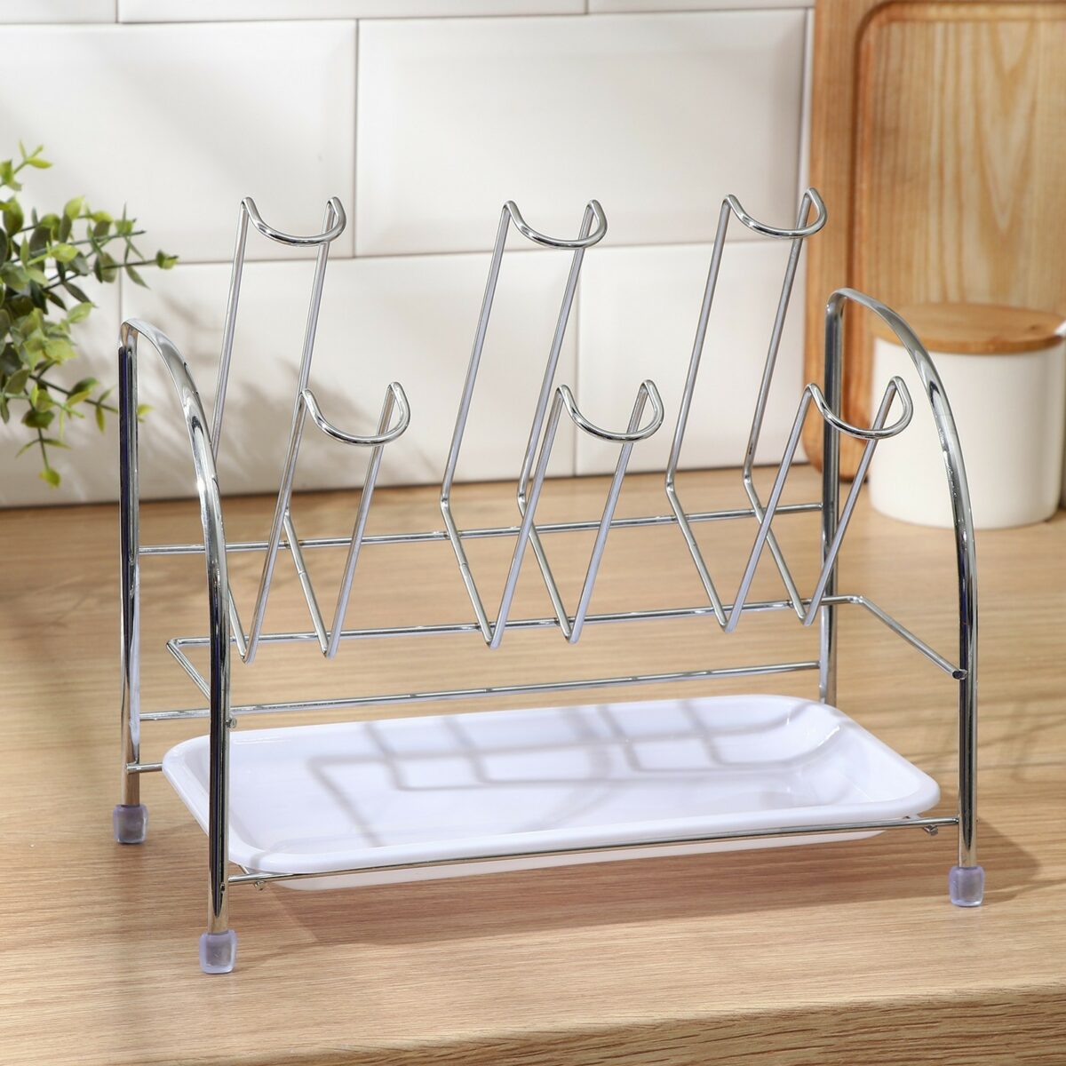 Сушилка для стаканов настольная с поддоном, 6 кружек, хром, 25×13.5×21 см, серая