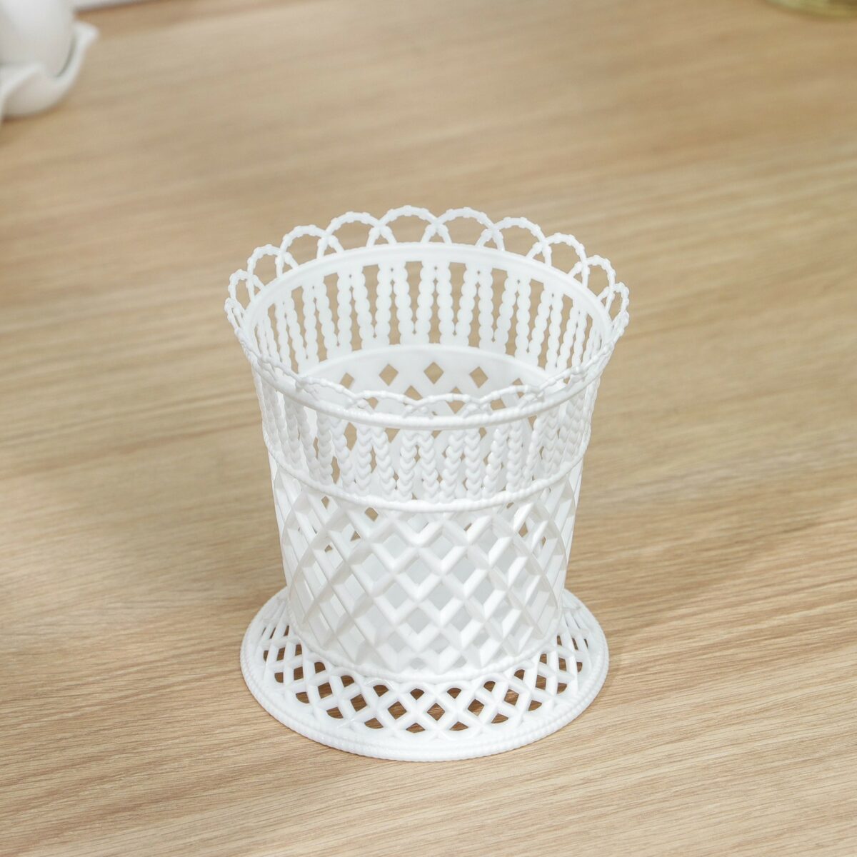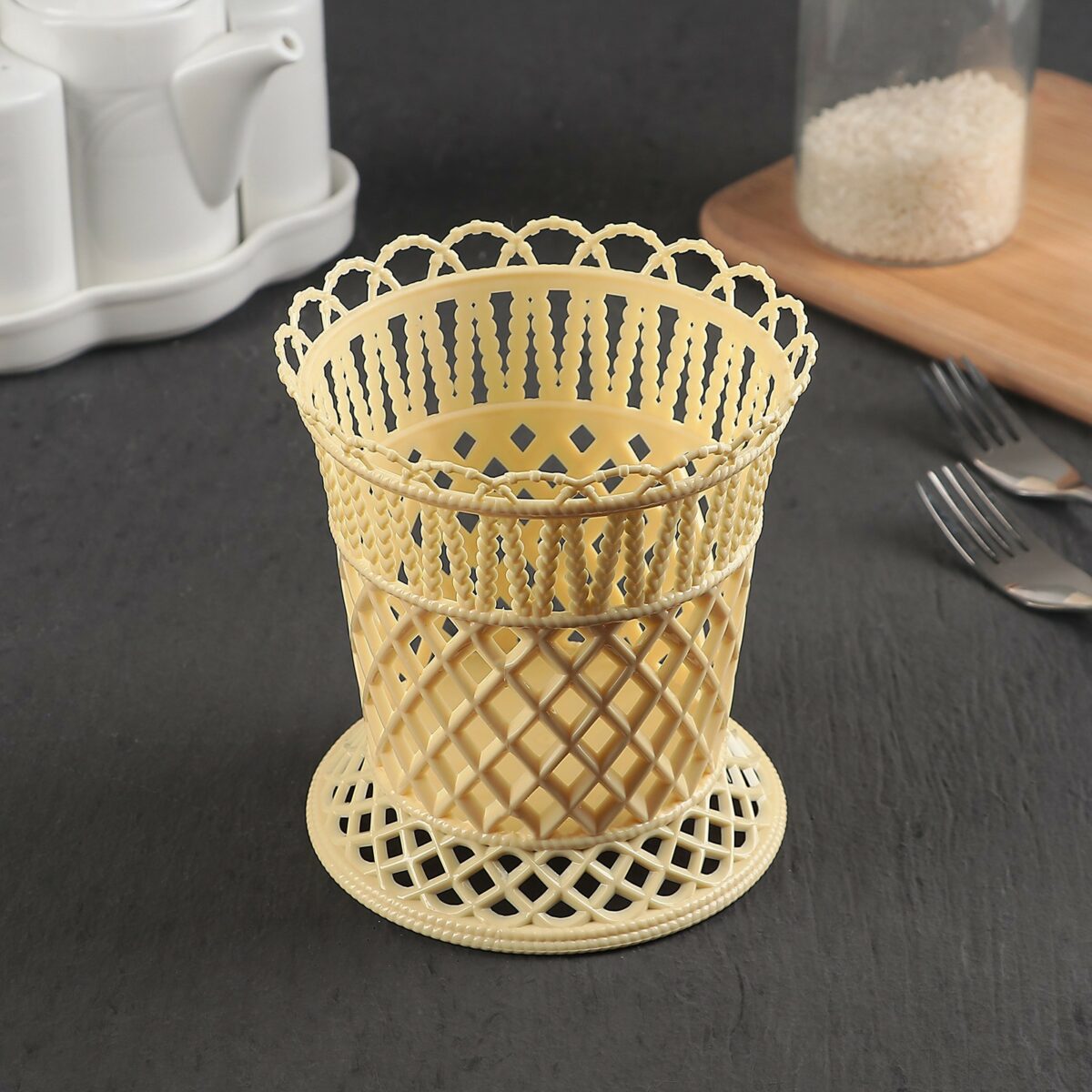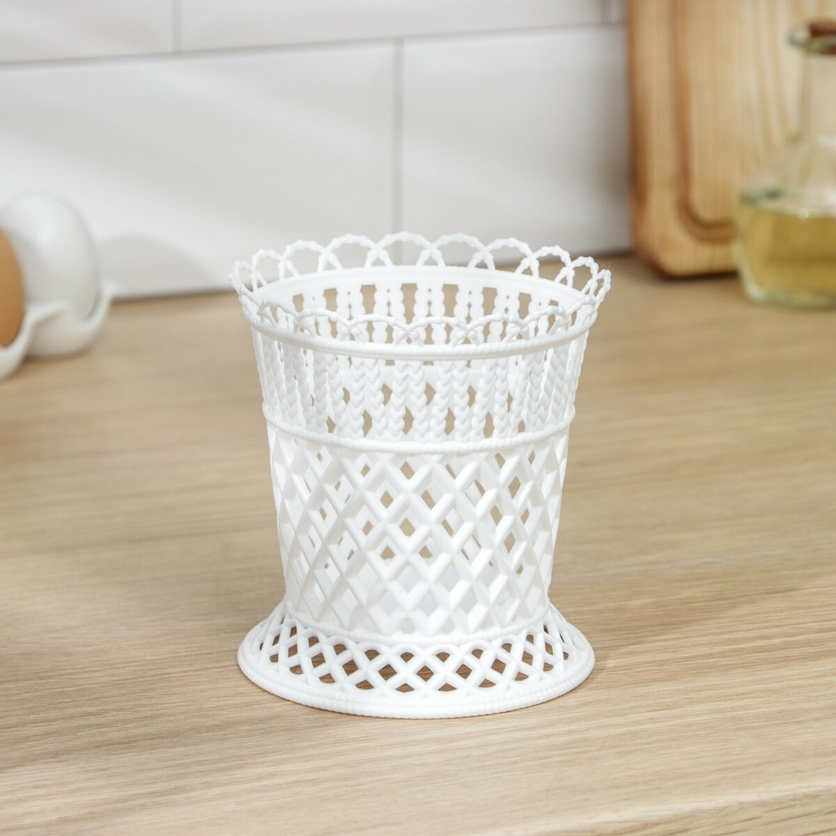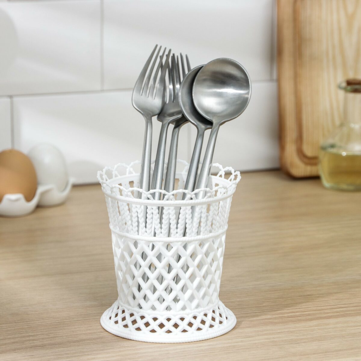 Дизайн изделия особенно выделяется благодаря ажурным узорам в виде плетения и декоративной окантовке по верхнему краю. Открытая конструкция обеспечивает свободную циркуляцию воздуха, что предотвращает скопление влаги и ускоряет сушку столовых приборов. Простой, но стильный внешний вид подставки позволяет адаптировать её к кухонным интерьерам в любых цветовых решениях, а классический белый цвет делает её универсальным аксессуаром для ежедневного использования. Надёжное и устойчивое основание гарантирует стабильность даже при полном заполнении приборами.