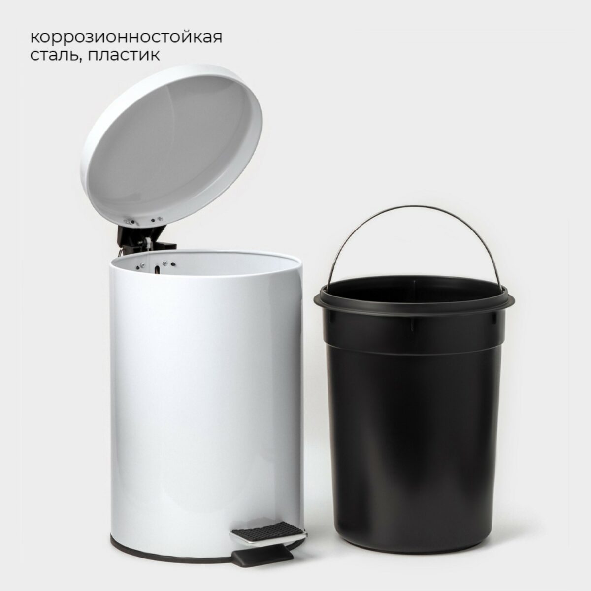 - Съемный внутренний вкладыш: Внутри находится пластиковое ведро с удобной металлической ручкой для легкого опустошения и уборки.