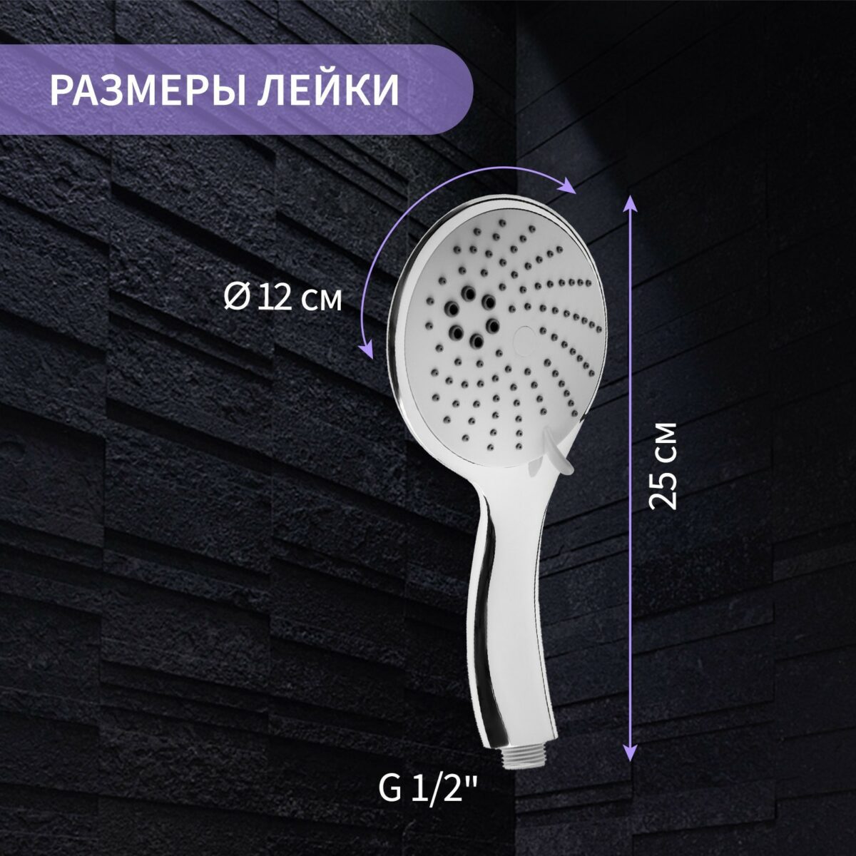 - Широкая душевая головка диаметром 12 см для равномерного распределения воды.