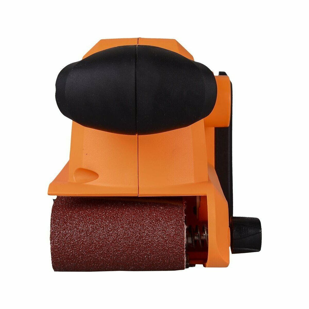 Ленточная шлифовальная машина яркого оранжевого цвета — мощный, компактный инструмент на 900 Вт с удобной рукояткой для точной обработки поверхностей.