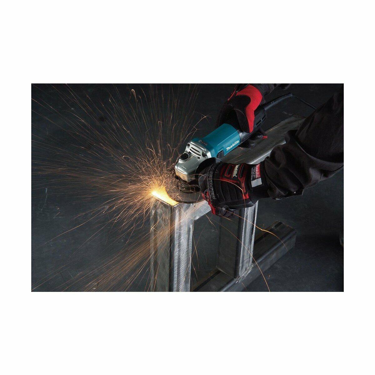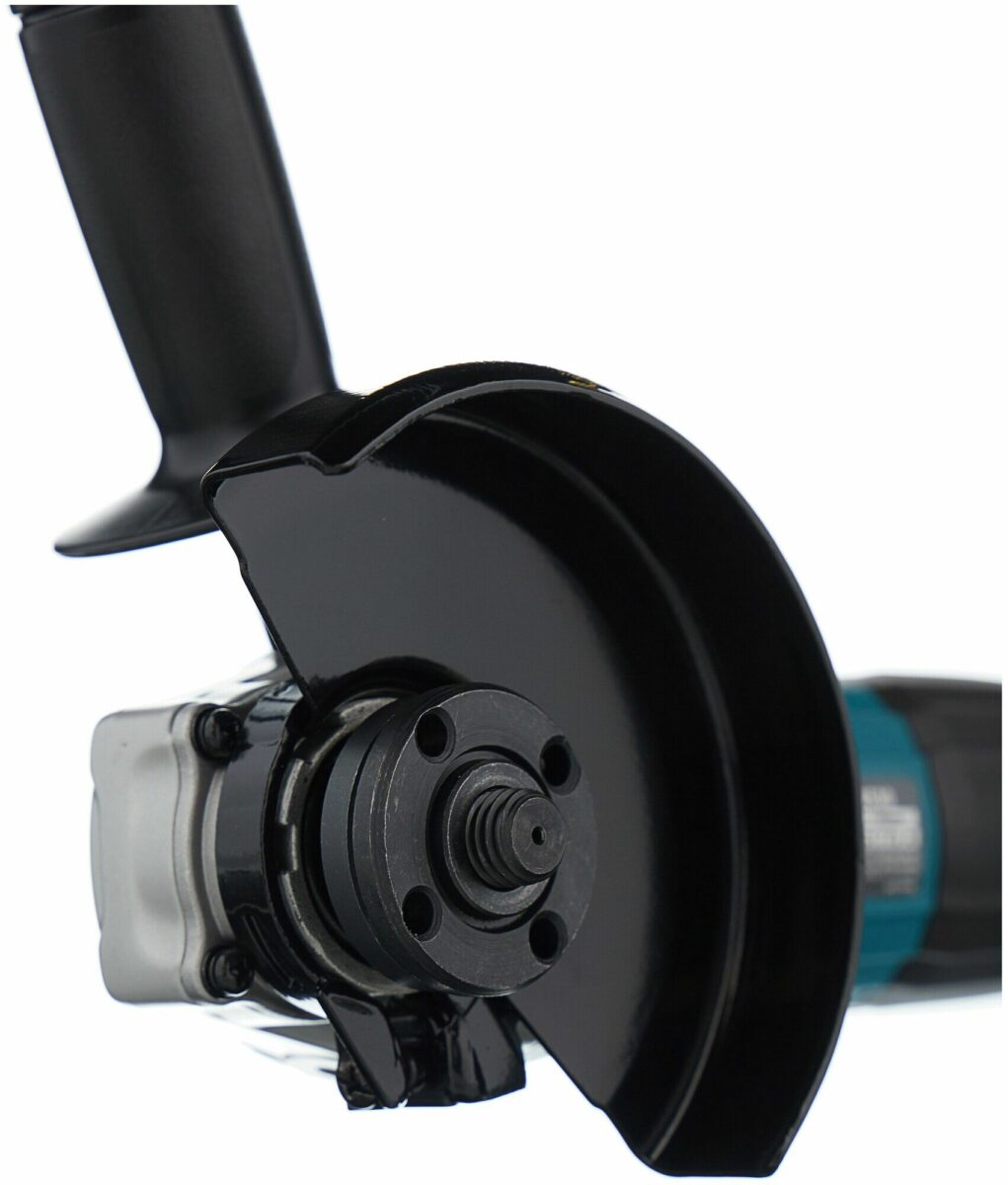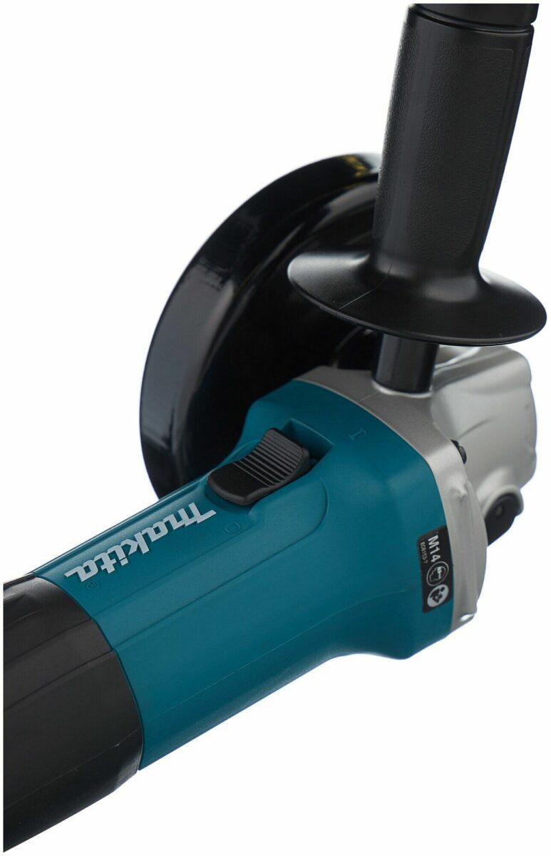 Особенности дизайна и удобство использования: Корпус шлифовальной машины выполнен в фирменных цветах Makita — бирюзово-черной гамме, с элементами металлического оттенка. Оборудование дополнено защитным кожухом, предназначенным для блокировки искр, а также имеет дополнительную резиновую рукоятку, которая обеспечивает комфортный захват и устойчивость во время работы. В корпусе предусмотрены вентиляционные отверстия для эффективного охлаждения двигателя. Также на инструменте видна маркировка "М14" — стандарт резьбы шпинделя, что обеспечивает легкую совместимость с различными дисками на рынке.