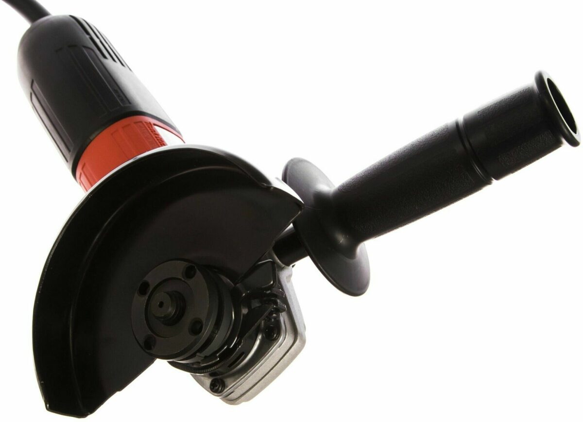 Углошлифовальная машина оснащена защитным кожухом, который предотвращает попадание искр и частей материала на пользователя. Также есть вентиляционные отверстия, которые помогают охлаждать двигатель и предотвращают перегрев.