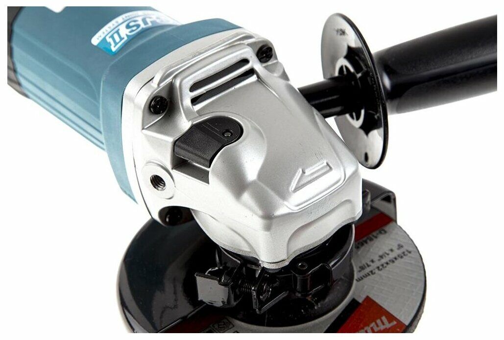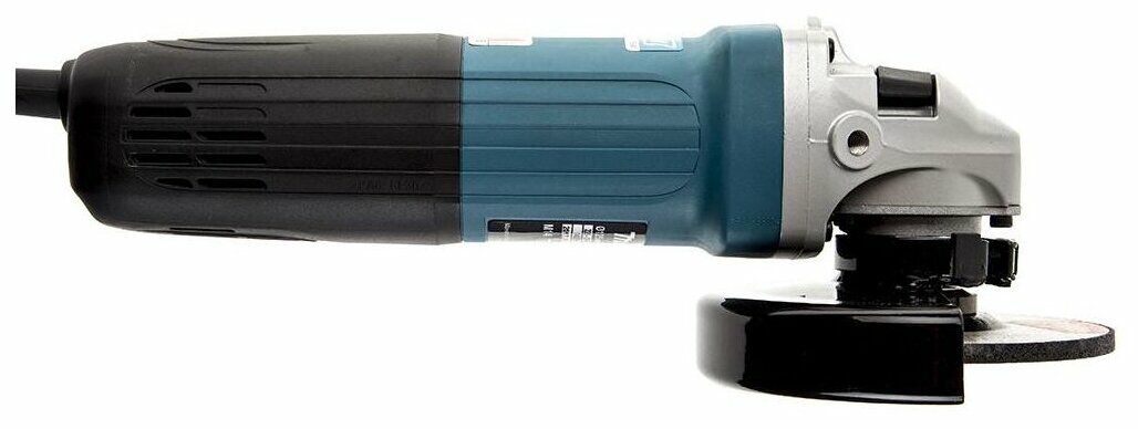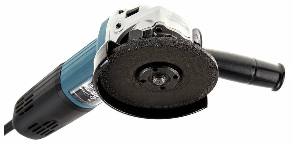 Инструмент отличается эргономичным дизайном и продуманной конструкцией, что делает работу удобной и безопасной. Корпус выполнен в фирменном бирюзовом цвете с элементами черного и серебристого оттенков, что характерно для бренда Makita. В передней части корпуса расположена металлическая редукторная секция, которая обеспечивает долговечность и надежность при интенсивной эксплуатации. Угловая шлифовальная машина оснащена дополнительной боковой ручкой, которая способствует комфортному удержанию инструмента и повышает точность обработки. Для защиты пользователя предусмотрен защитный кожух, который оберегает оператора от искр, летящих во время работы.