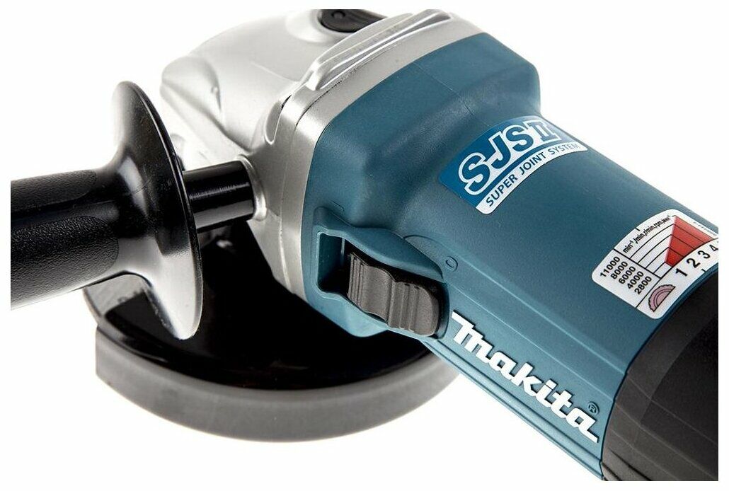 Мощная и стильная болгарка от Makita, сочетающая передовые технологии SJS и удобство использования, идеально для точной работы благодаря регулируемым скоростям и эргономике.
