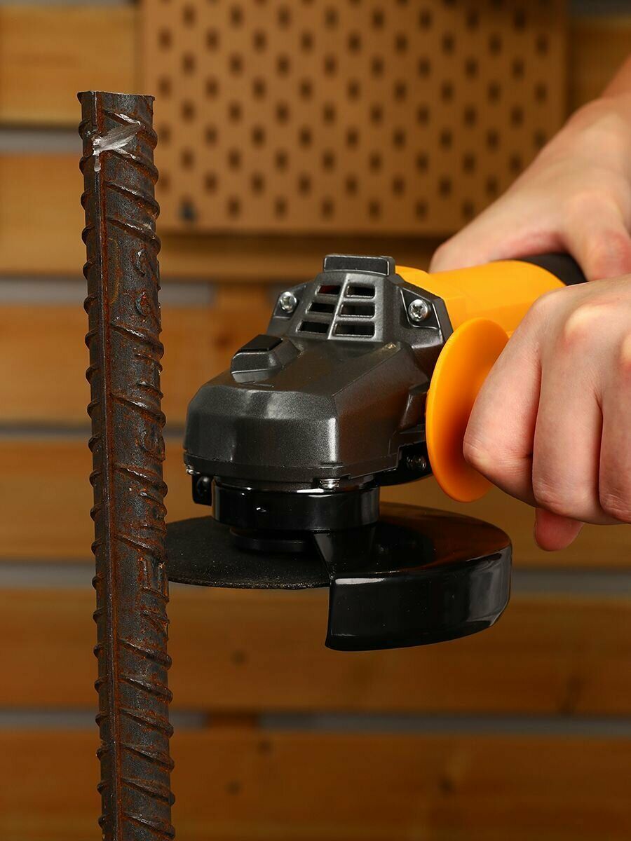 Мощная болгарка с яркой желтой ручкой и надежным защитным кожухом легко справляется с ржавым металлом, превращая тяжелую работу в удовольствие.