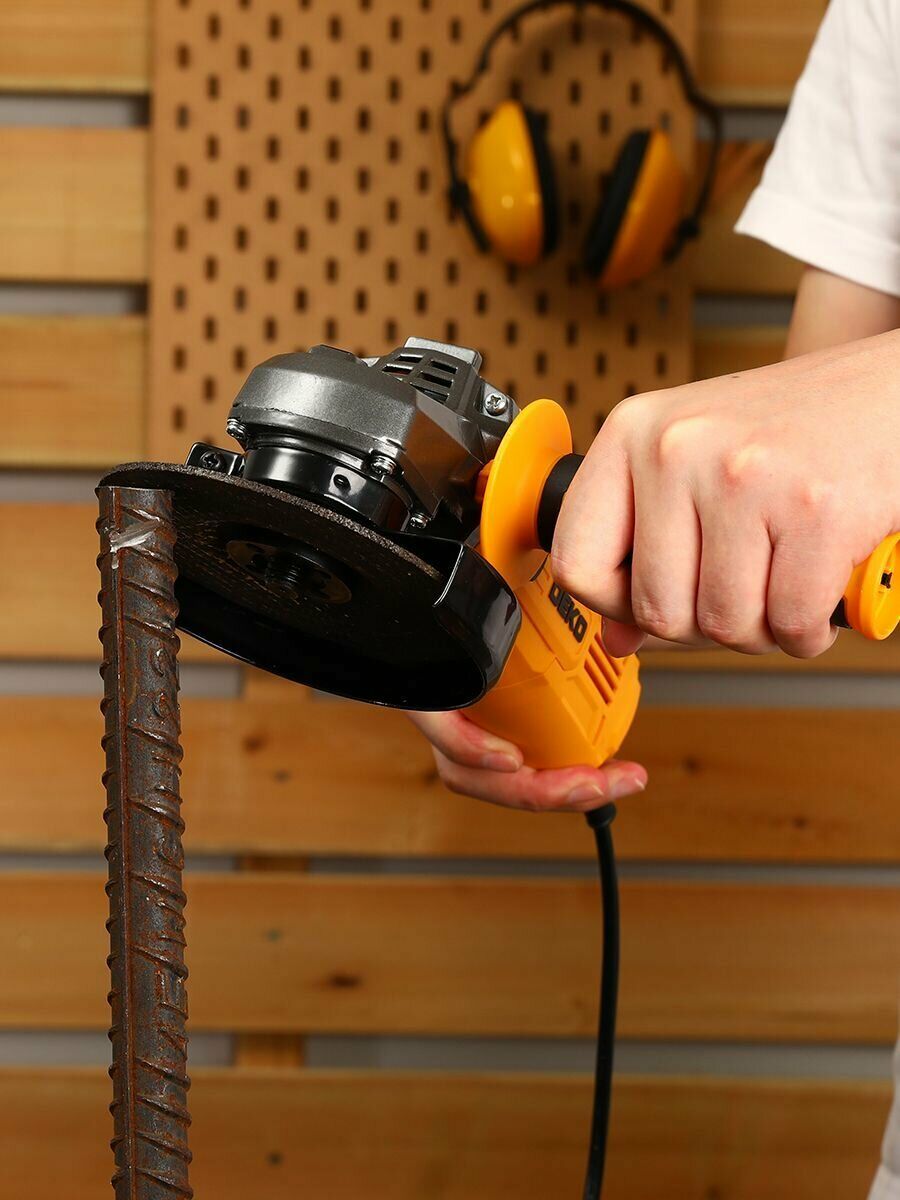 Ярко-желтая болгарка DEKO уверенно справляется с металлическим прутом, демонстрируя мощь и надежность инструмента. Всё продумано до мелочей: защитный кожух, эргономичный корпус и намек на безопасность с помощью средств защиты на заднем фоне.