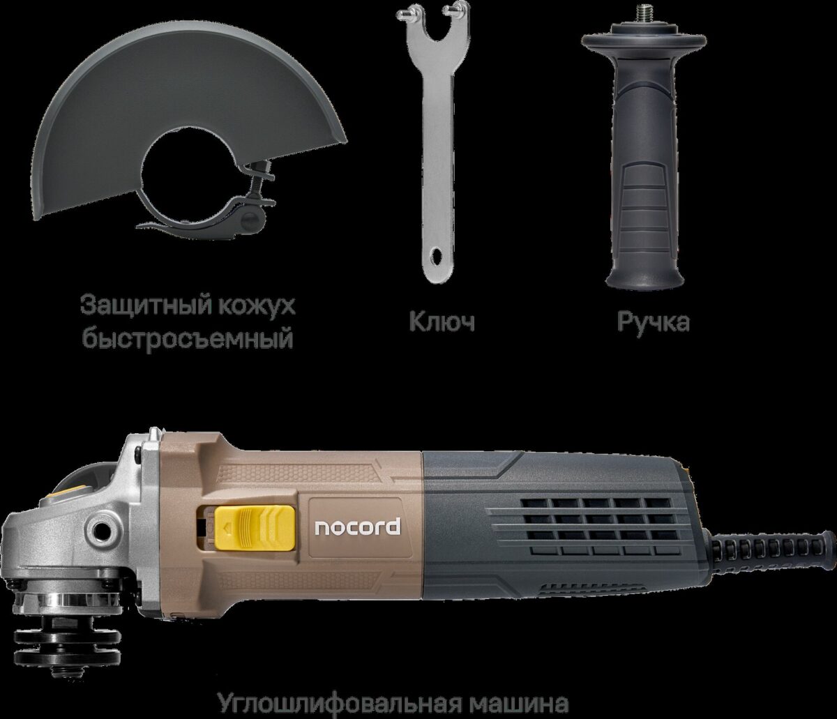 Угловая шлифовальная машина (УШМ) Nocord — это универсальный инструмент для ремонтных и садовых работ, созданный на базе технологий «Яндекс Фабрики». Основное назначение устройства — шлифовка, резка, зачистка поверхности и удаление различных дефектов. Будь то обработка металла, дерева или камня — болгарка Nocord станет вашим надежным помощником в выполнении повседневных задач дома, на даче или в профессиональной мастерской. Данный инструмент сочетает в себе продуманный современный дизайн, мощность в 1100 Вт, прочные материалы корпуса и эргономичность.