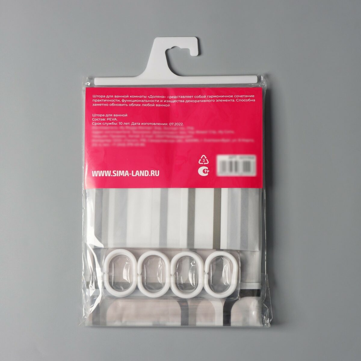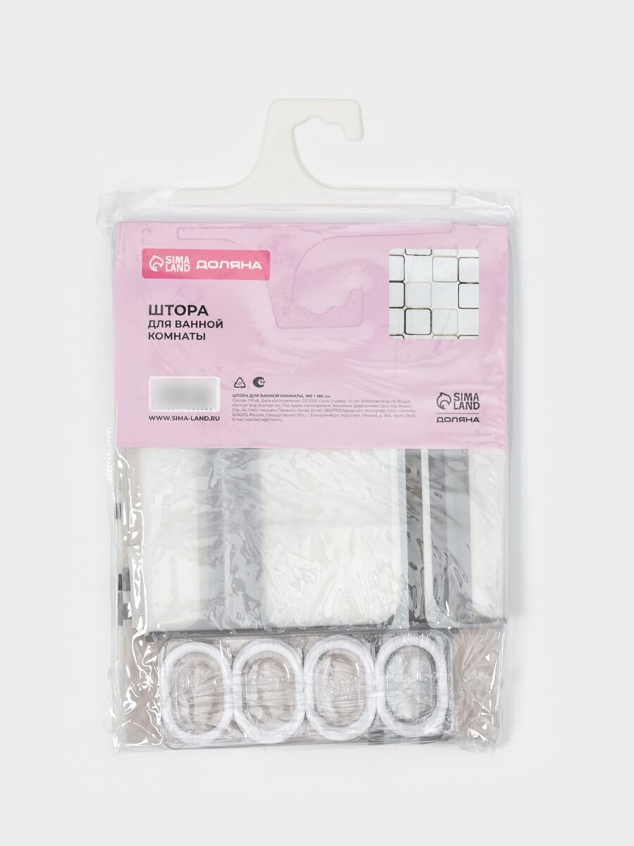 Штора выполнена из экологичного материала PEVA, который отличается легкостью, водонепроницаемостью и устойчивостью к образованию плесени.