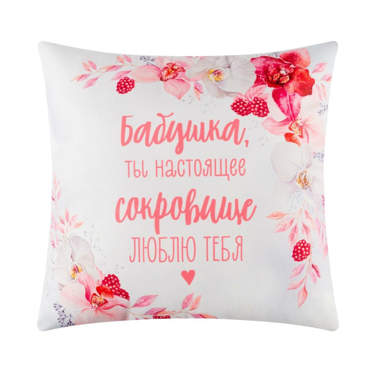 Квадратная подушка 40×40 см выполнена в светлых пастельных тонах, которые легко впишутся в любой стиль интерьера. На ее поверхности располагается гармоничный флористический орнамент с нежно-розовыми цветами, а надпись «Бабушка, ты настоящее сокровище. Люблю тебя» выполнена элегантным шрифтом теплого розового оттенка, создавая уютную и искреннюю атмосферу. Это подушка с рисунком, которая станет акцентным элементом декора в вашей гостиной, уютной спальне или даже на любимом кресле бабушки.