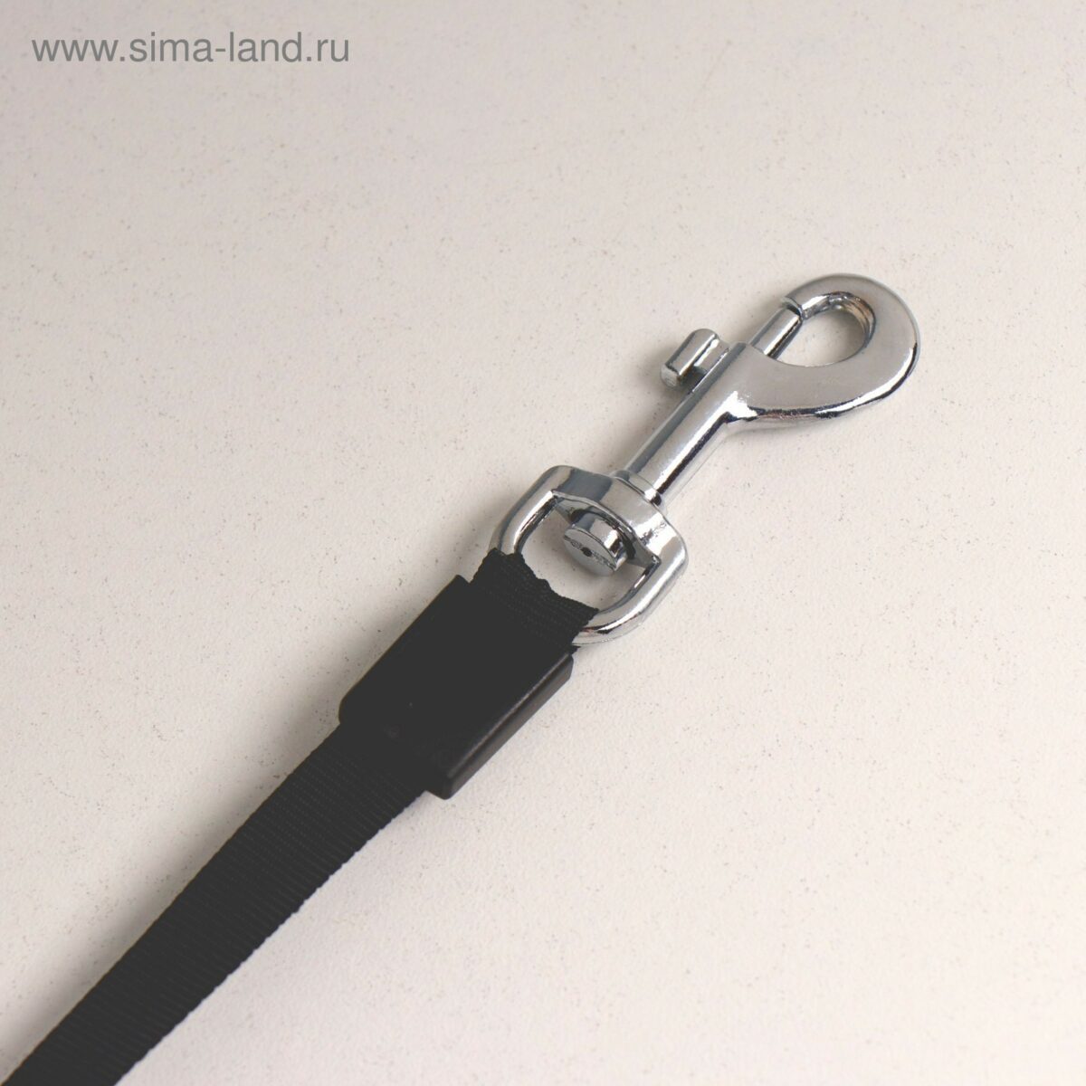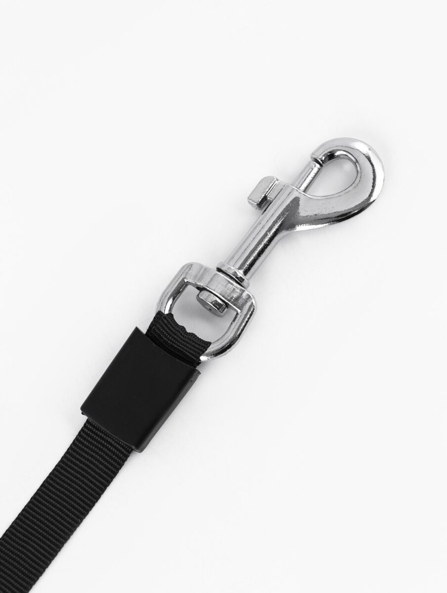 Металлический карабин с блестящим покрытием и плотным текстильным ремешком, подходящий для поводков рулетка и собак весом до 35 кг.