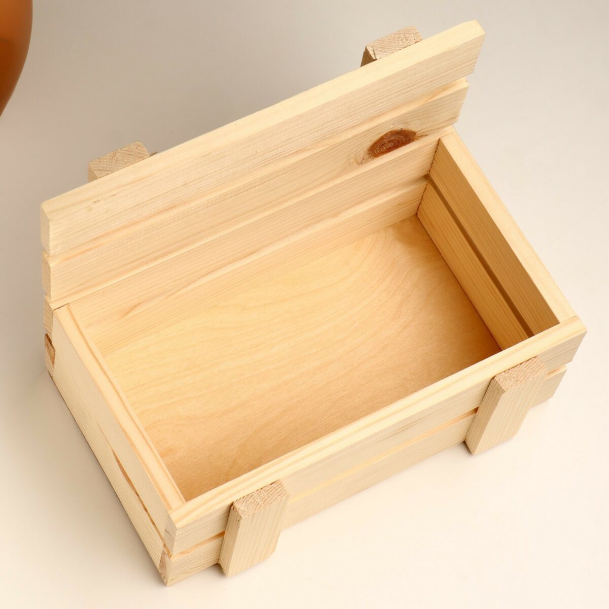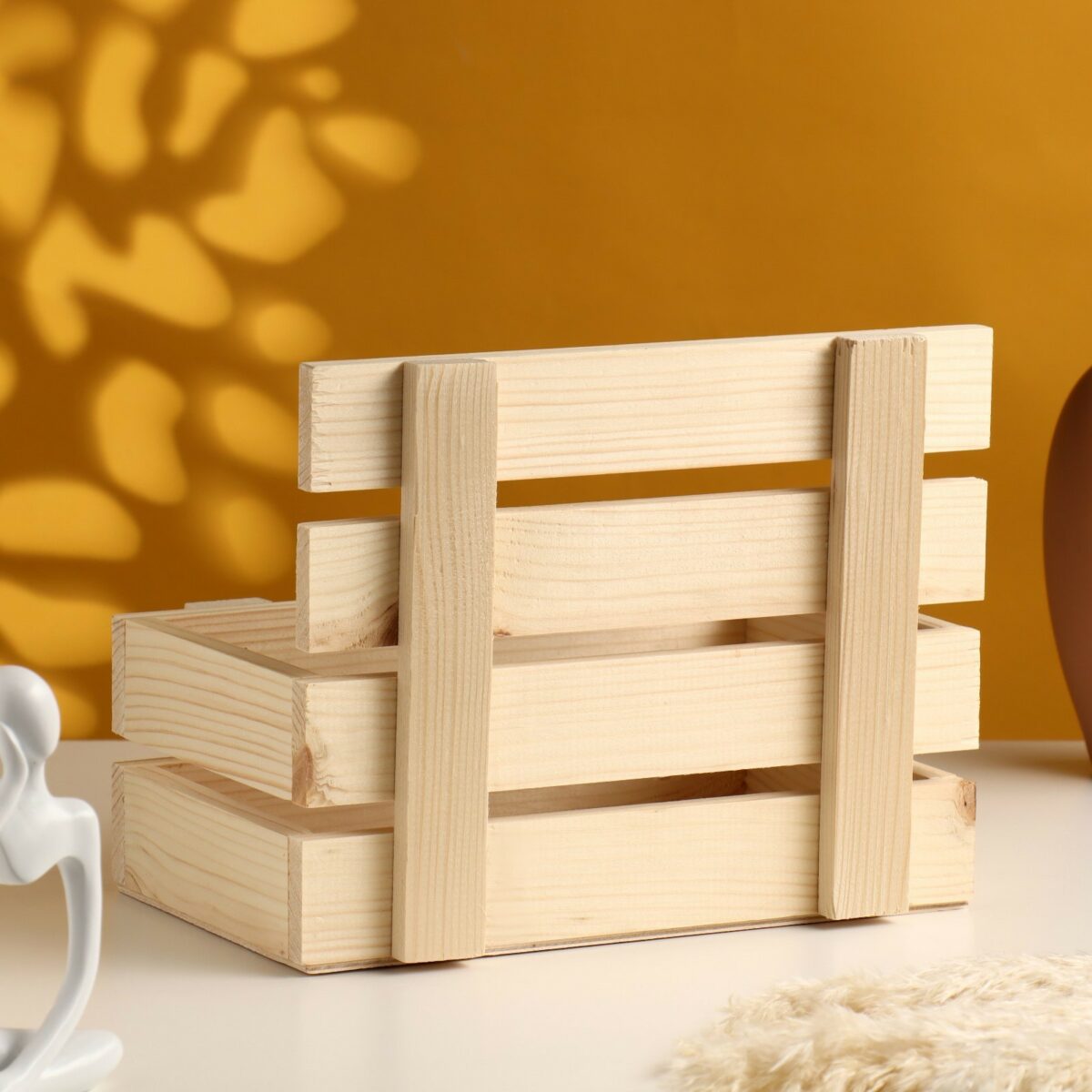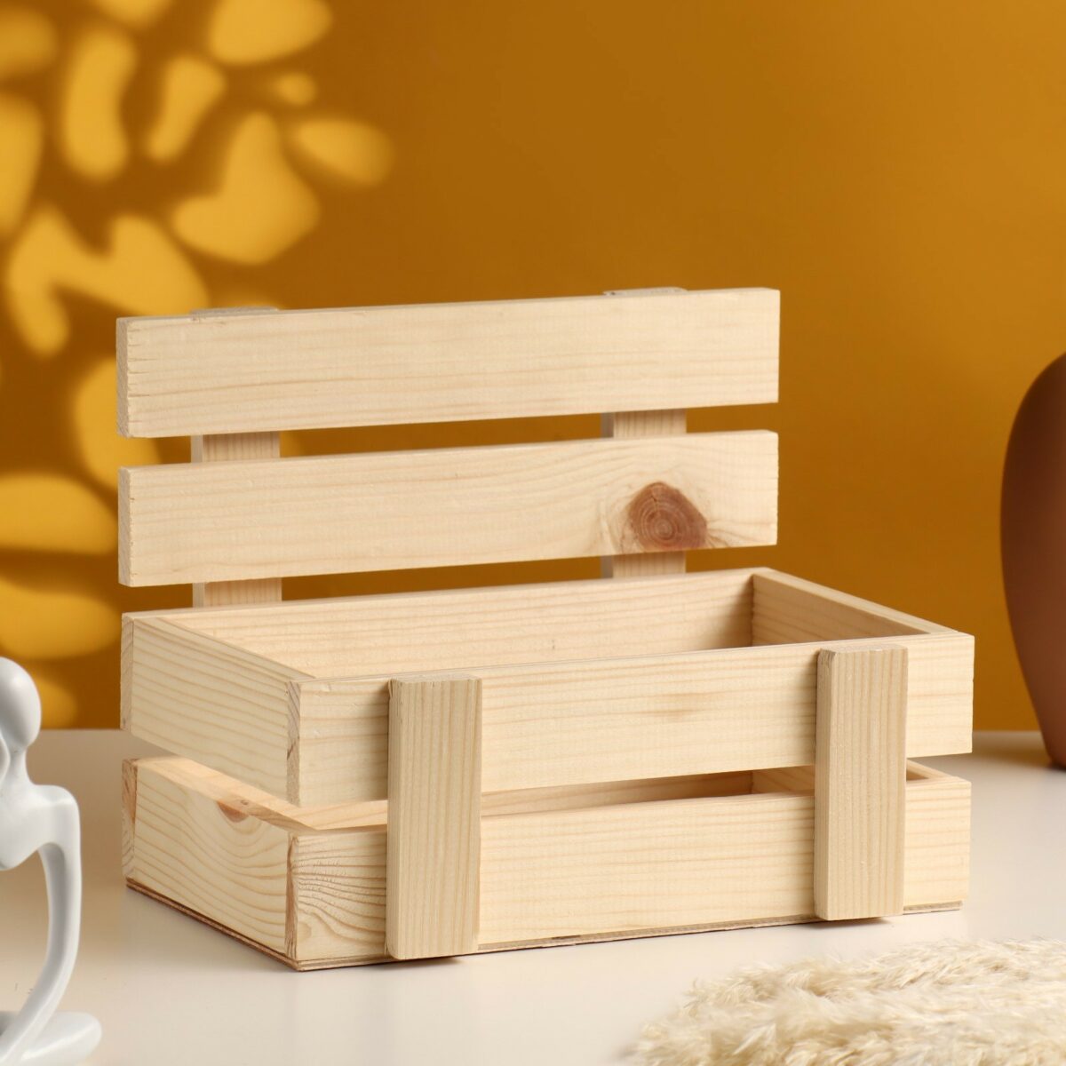 Кашпо выполнено из тщательно обработанных реек светлого дерева с видимой текстурой волокон и природными узорами, включая сучки и кольца древесины. Удобная и универсальная форма – прямоугольный ящик с открытым верхом – позволяет использовать его как для размещения растений, так и для хранения декоративных вещей. Габариты кашпо (24,5х16,5х19,5 см) обеспечивают его компактность, при этом простор внутренняя часть позволяет использовать изделие для различных декоративных и функциональных целей.